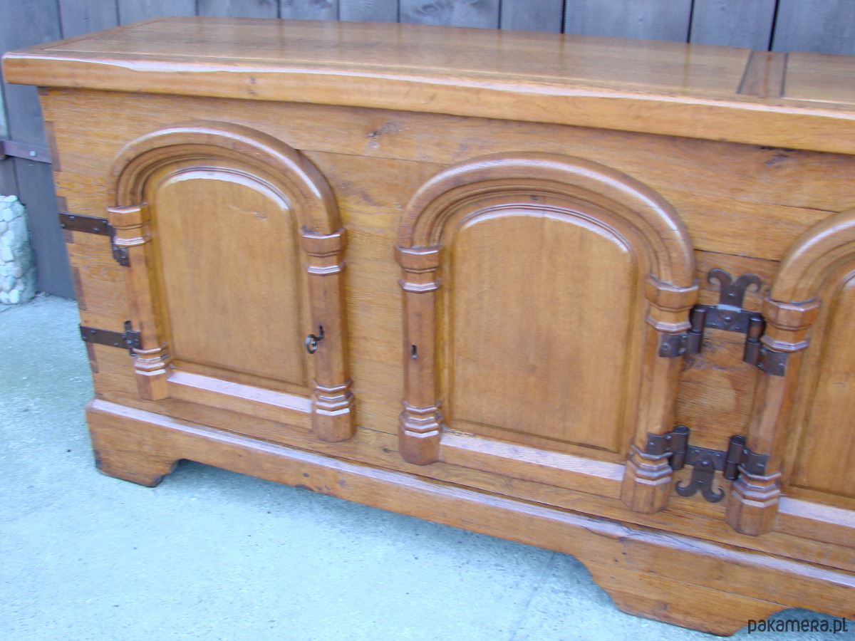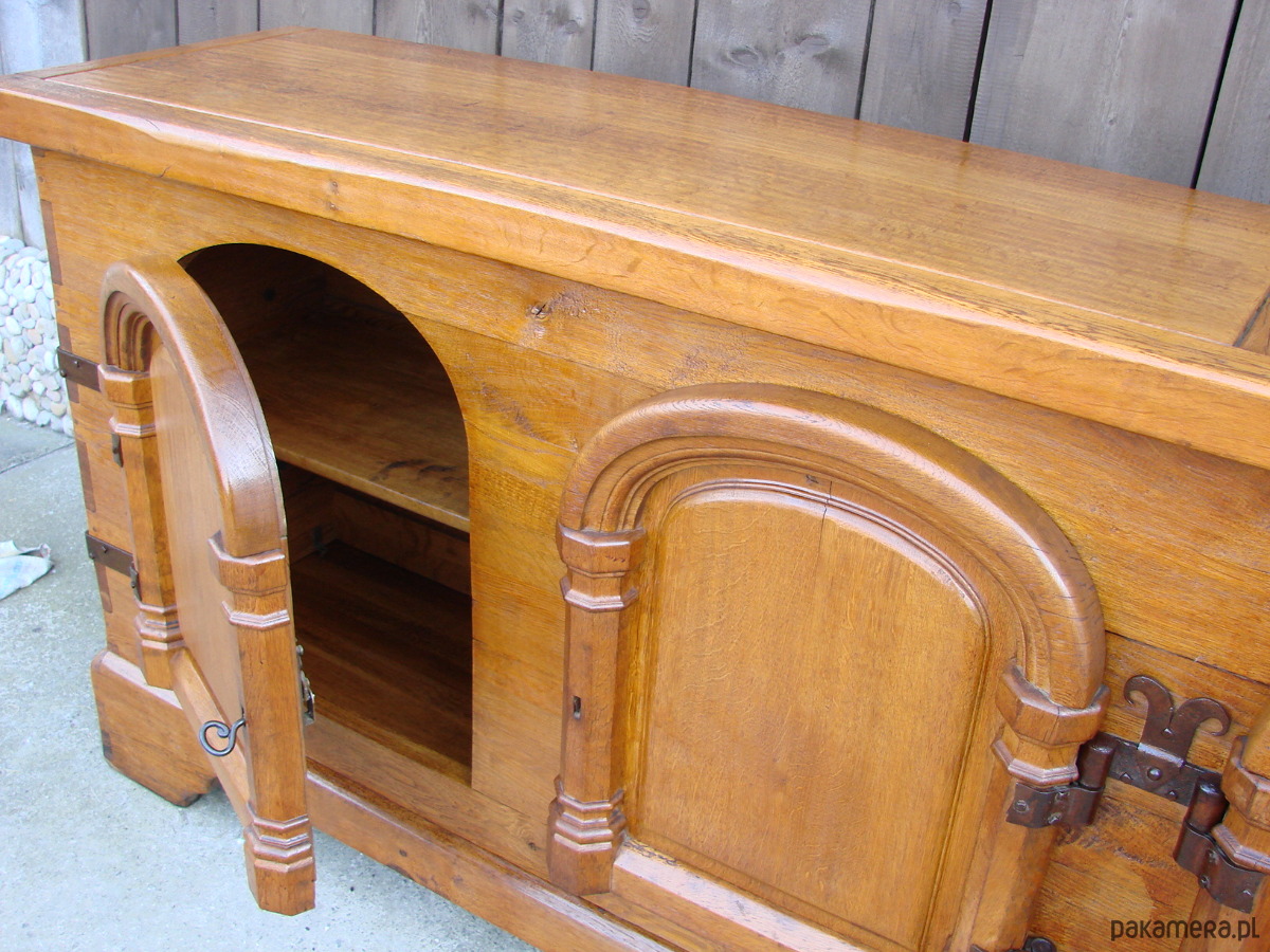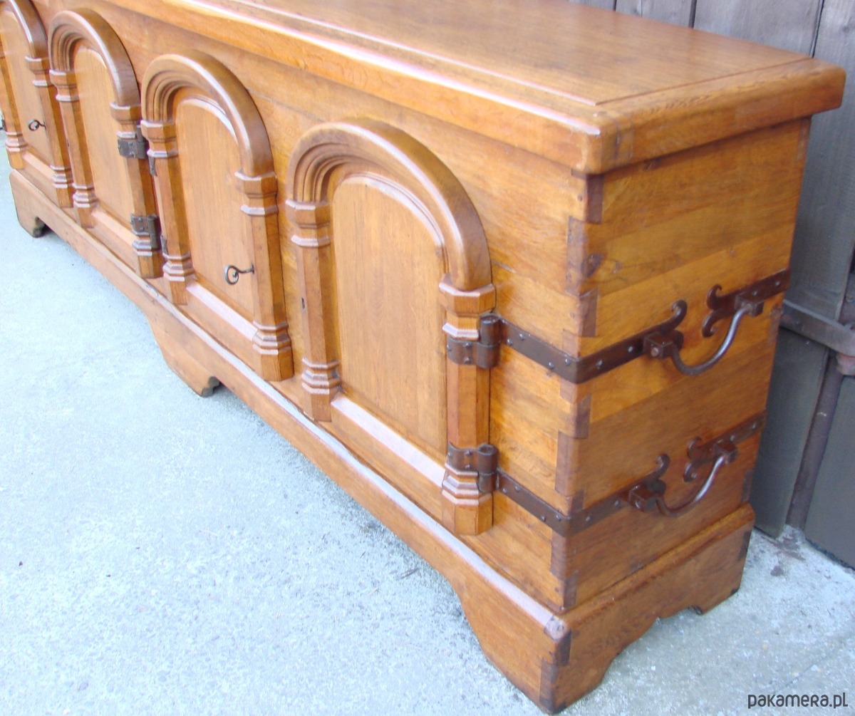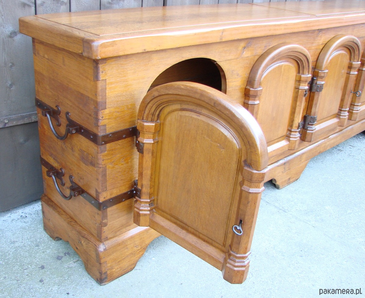 Imponująca komoda z lat 50. XX wieku, wykonana w całości z litego drewna dębowego. Mebel wykończony ręcznie kutymi zawiasami i okuciami, z tradycyjnymi łączeniami na drewniane kołki, co świadczy o wysokiej jakości rzemiosła.
