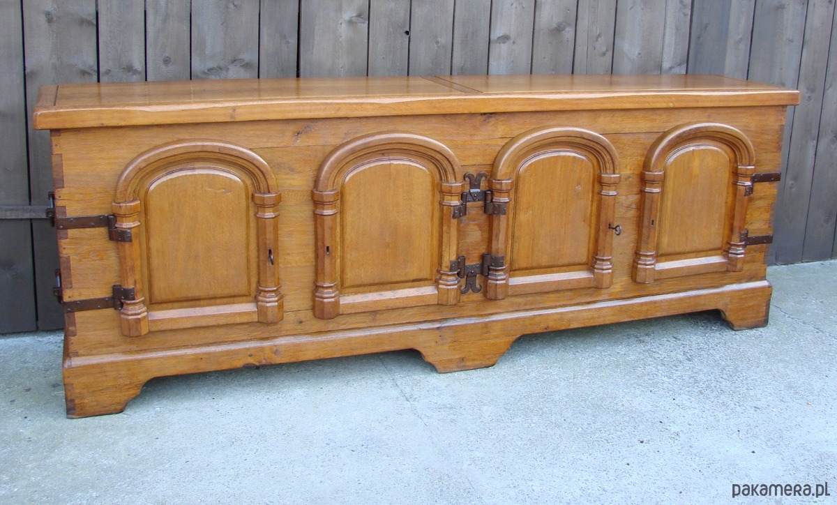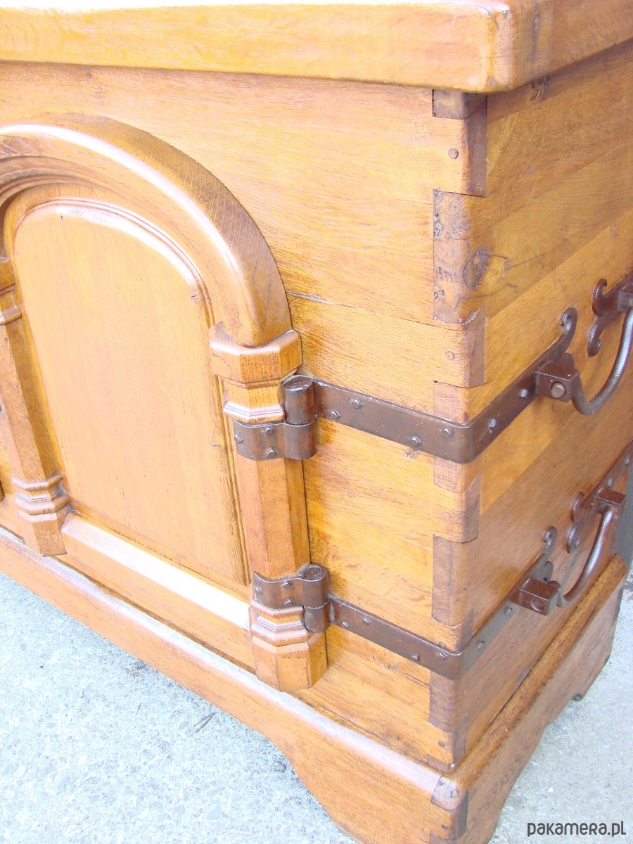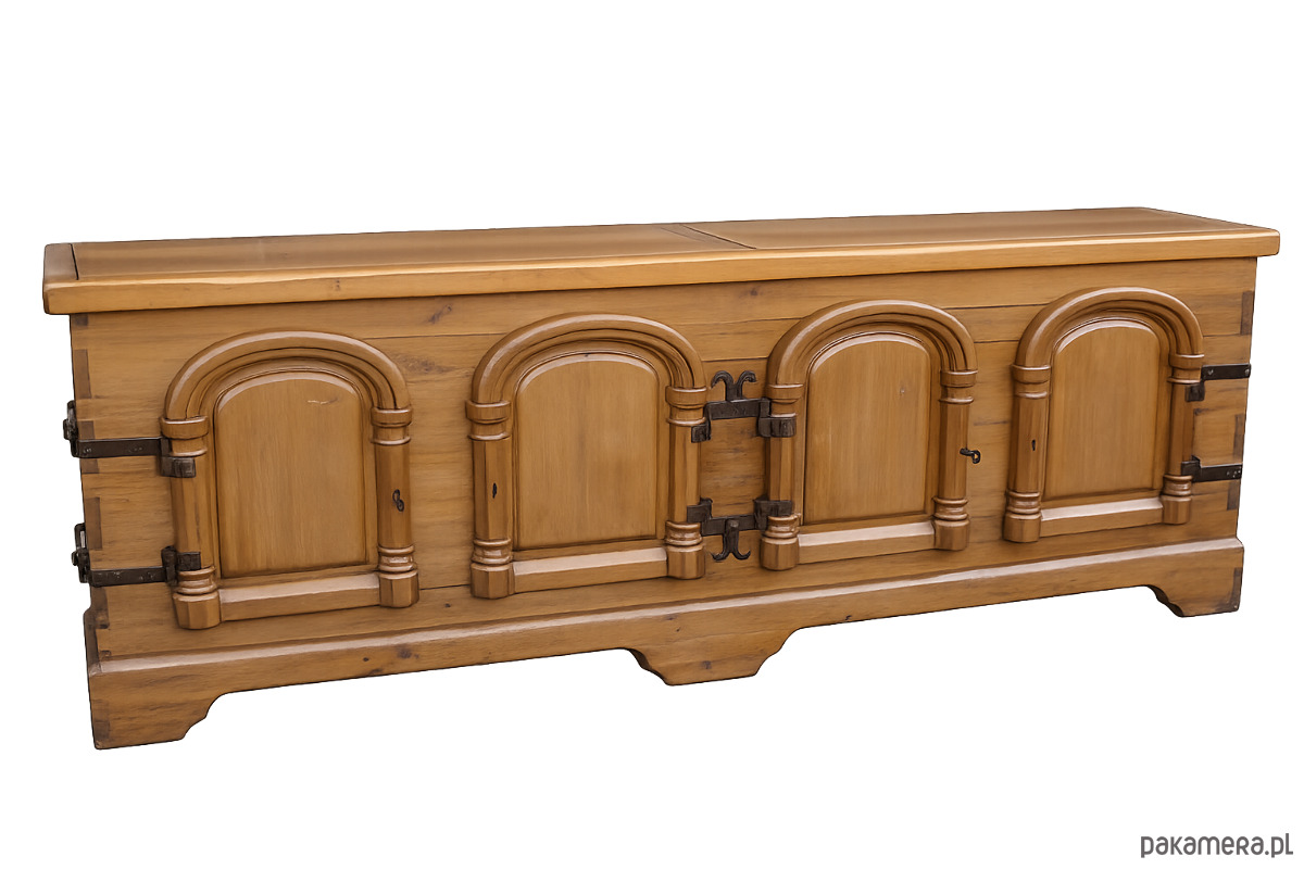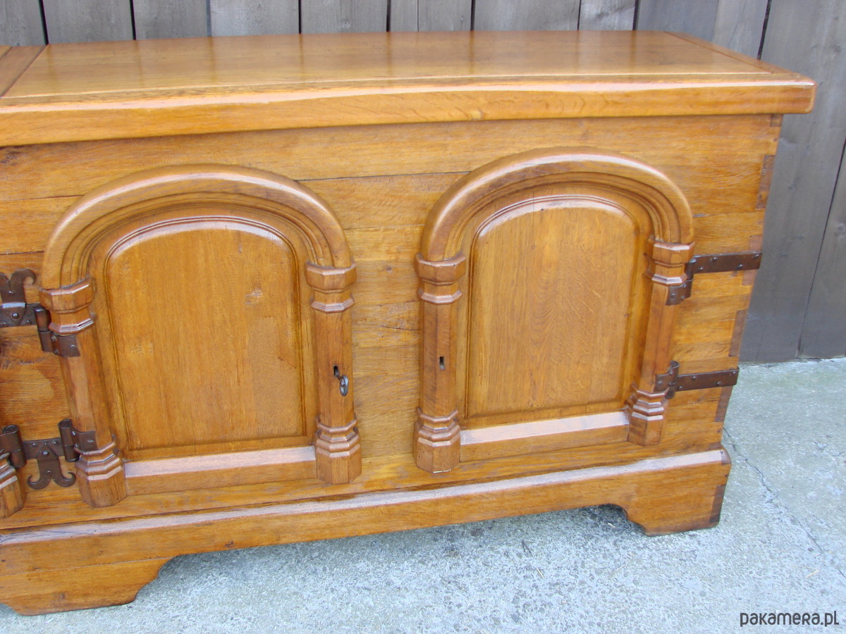 Imponująca komoda z lat 50. XX wieku, wykonana w całości z litego drewna dębowego. Mebel wykończony ręcznie kutymi zawiasami i okuciami, z tradycyjnymi łączeniami na drewniane kołki, co świadczy o wysokiej jakości rzemiosła.