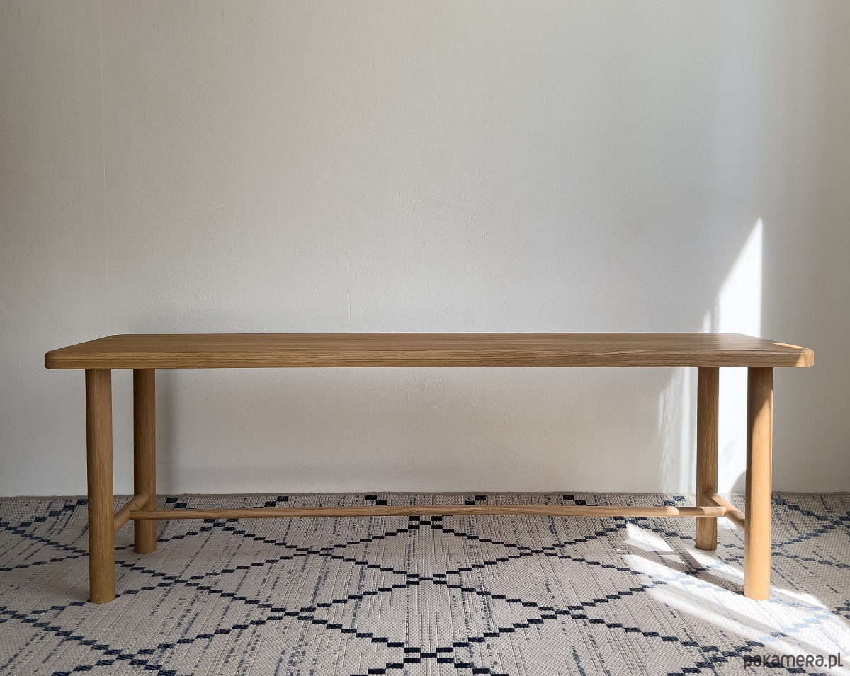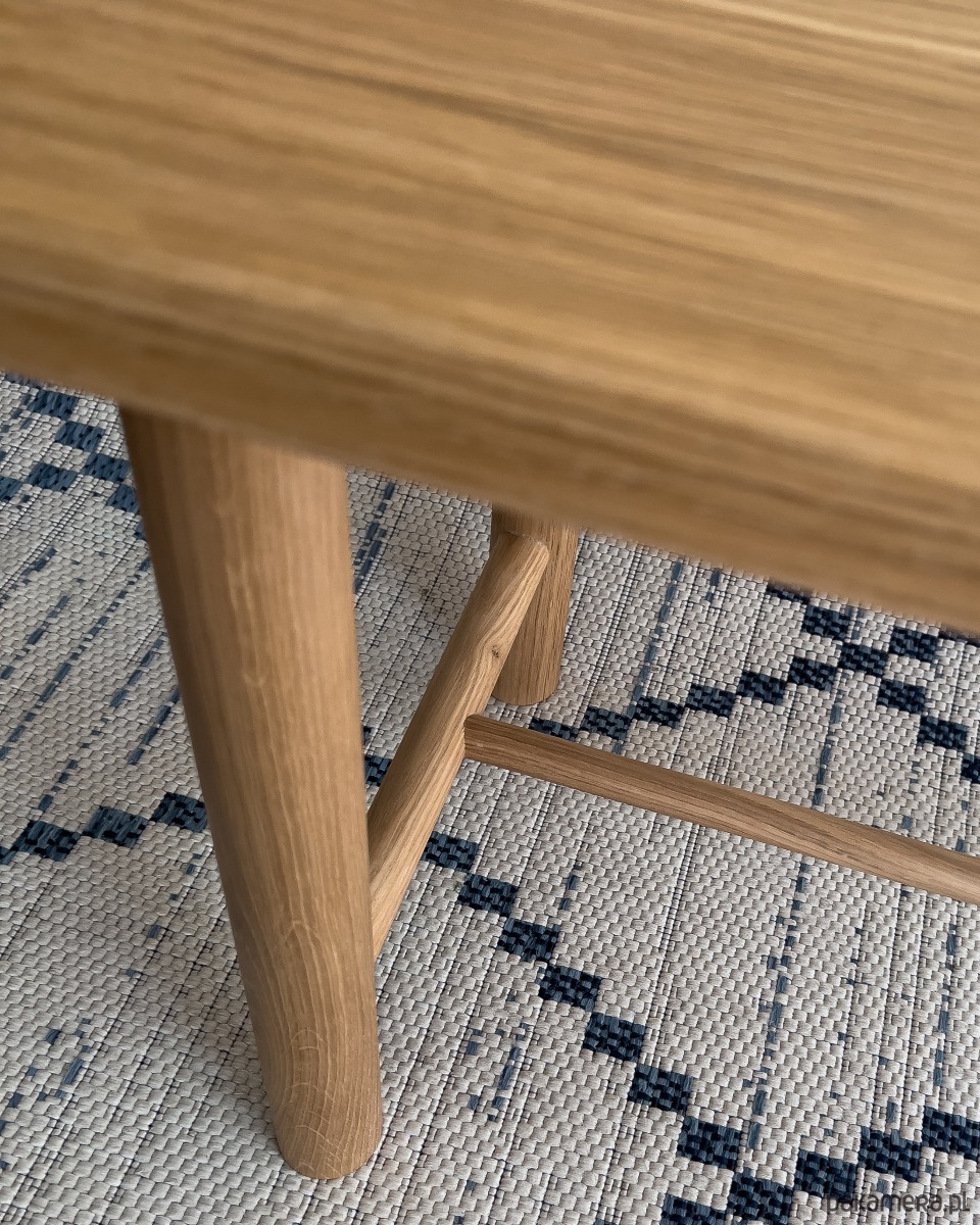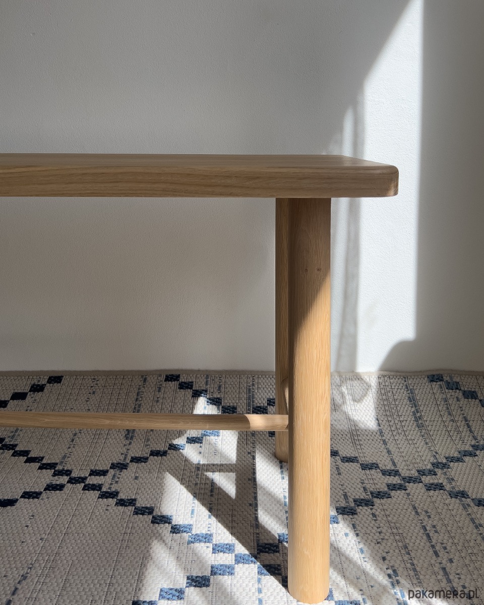 Ta pięknie wykonana ławka z drewna dębowego o wymiarach 140x39x47(wys)cm to nie tylko mebel, ale także wyraz luksusu i elegancji. Jej solidna konstrukcja opiera się na czterech nogach w kształcie walca, dodatkowo wzmocnionych dębowymi drążkami po bokach.