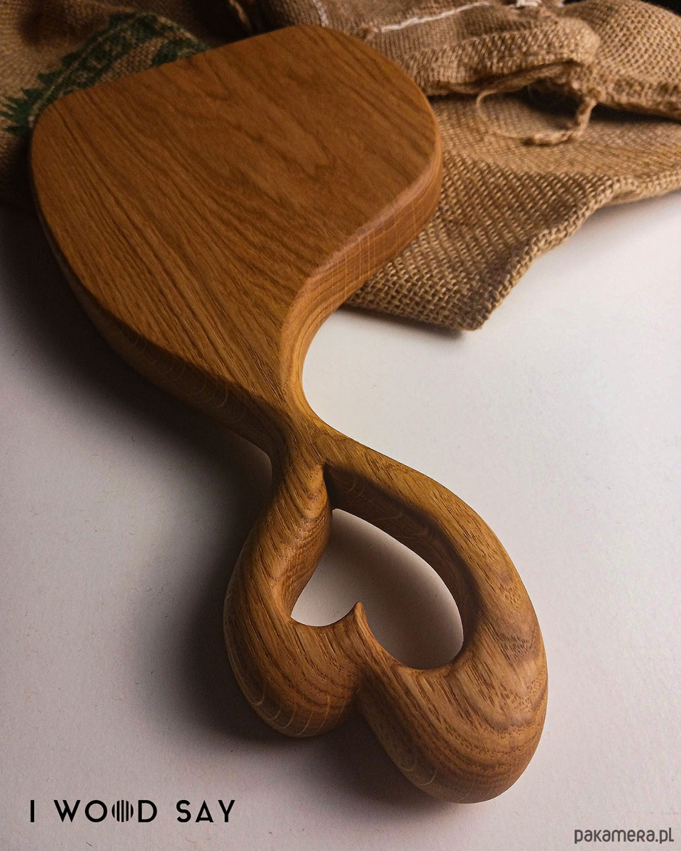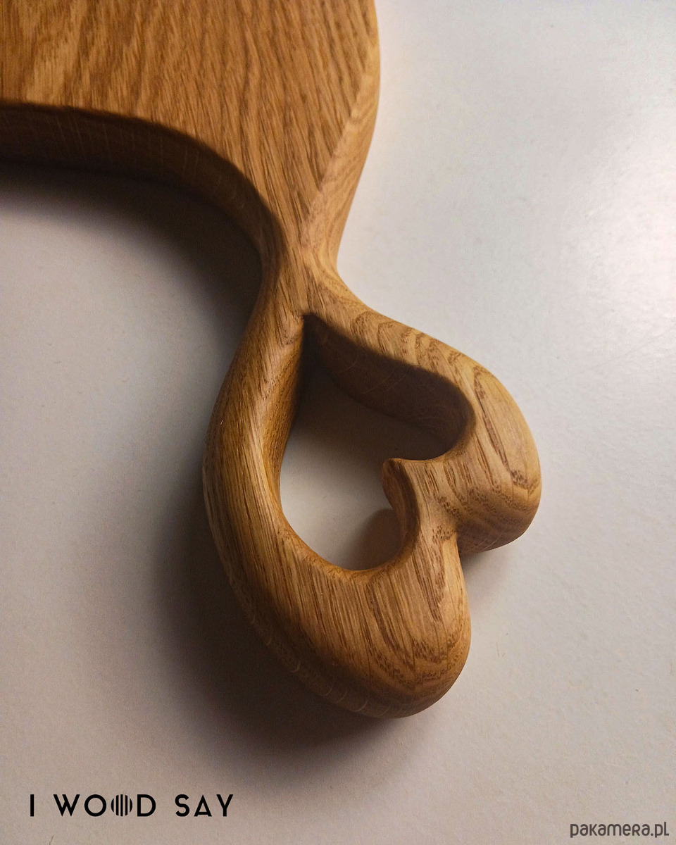 Deska z rzeźbionym uchwytem w kształcie serca, wykonana z jednego kawałka litego drewna dębowego.