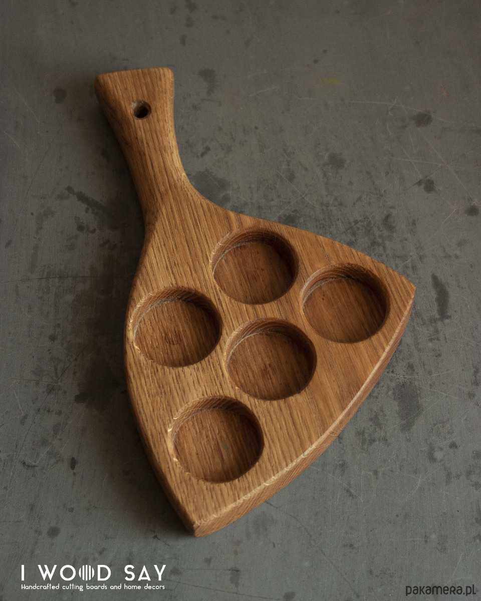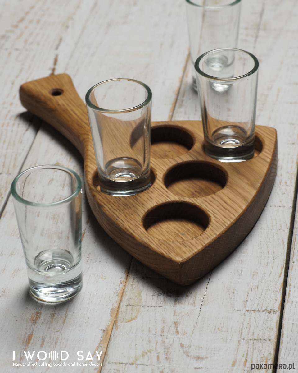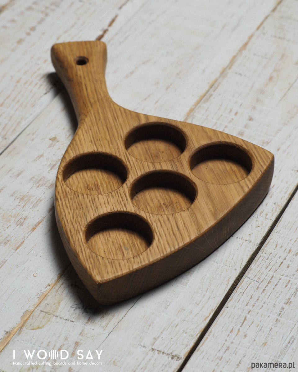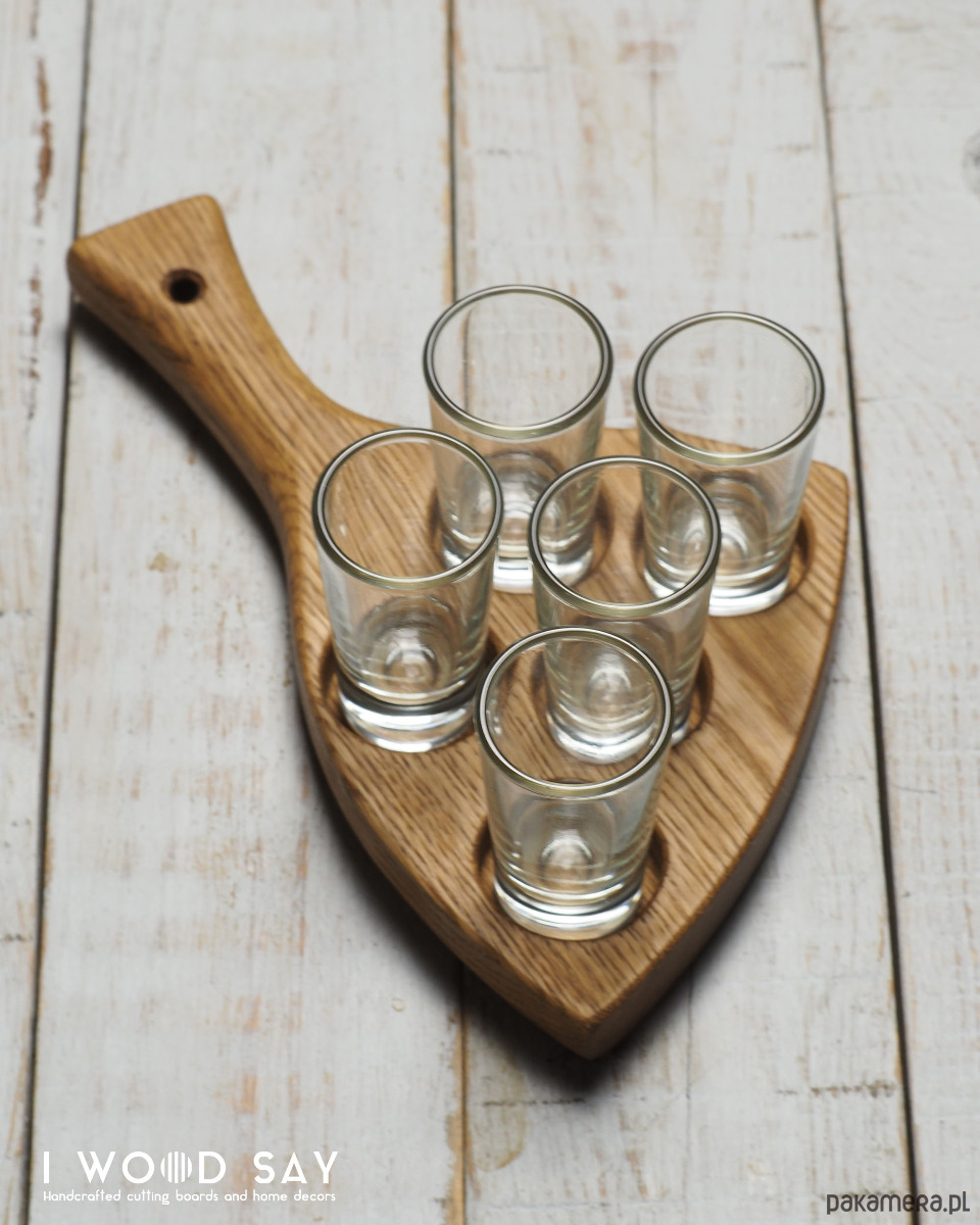 Dębowe pady do serwowania 5 szotów. Wykonane z jednego kawałka drewna.