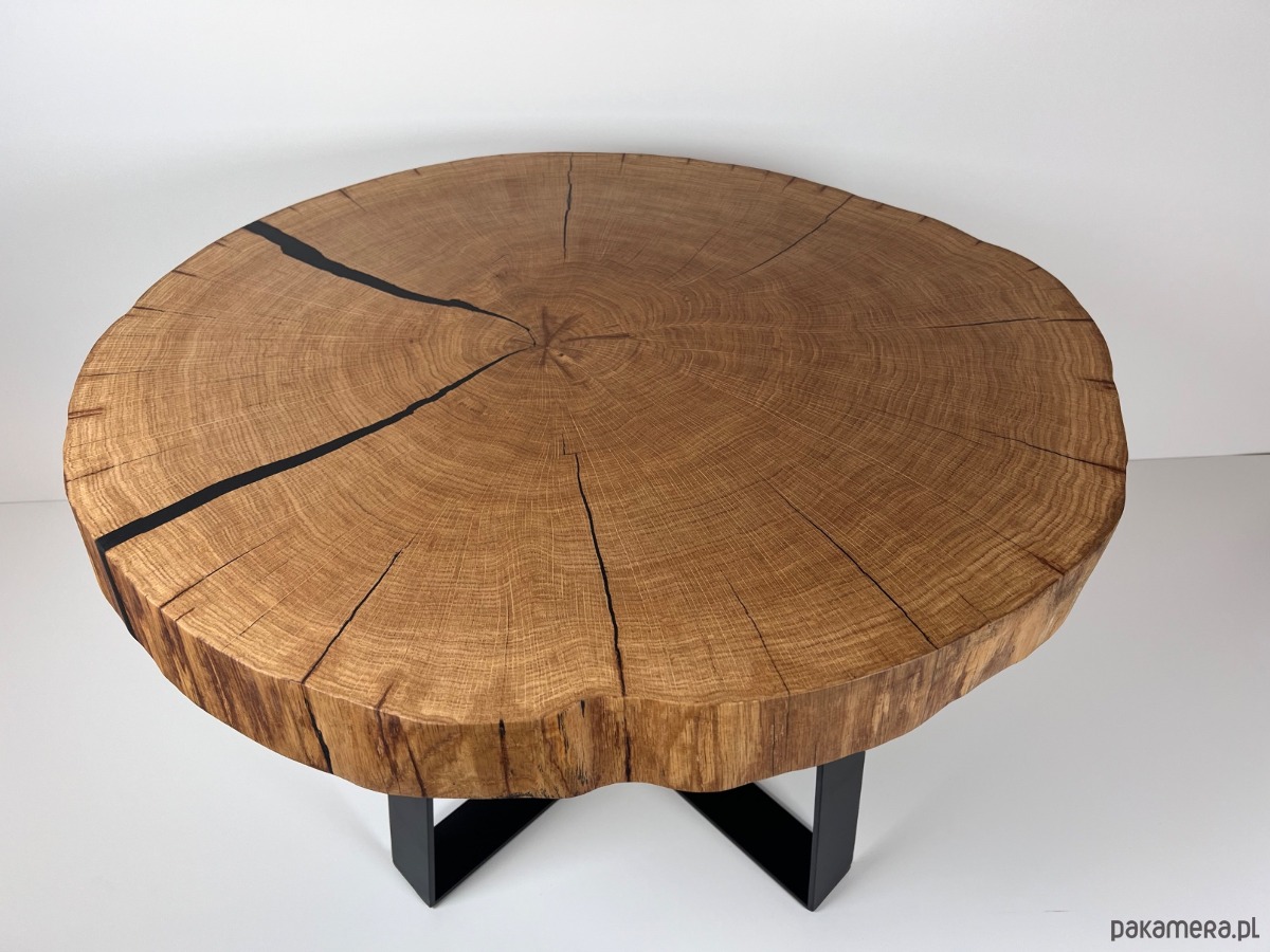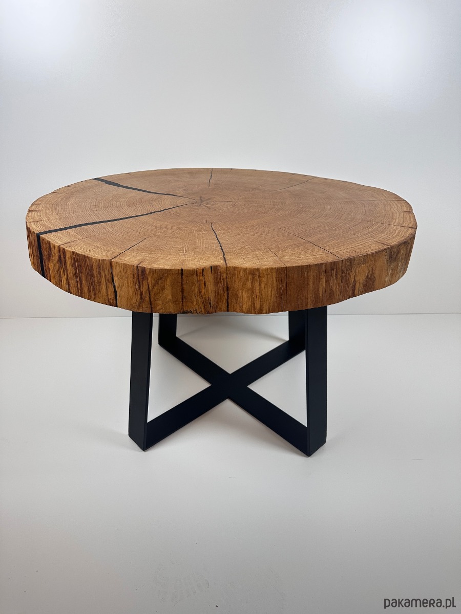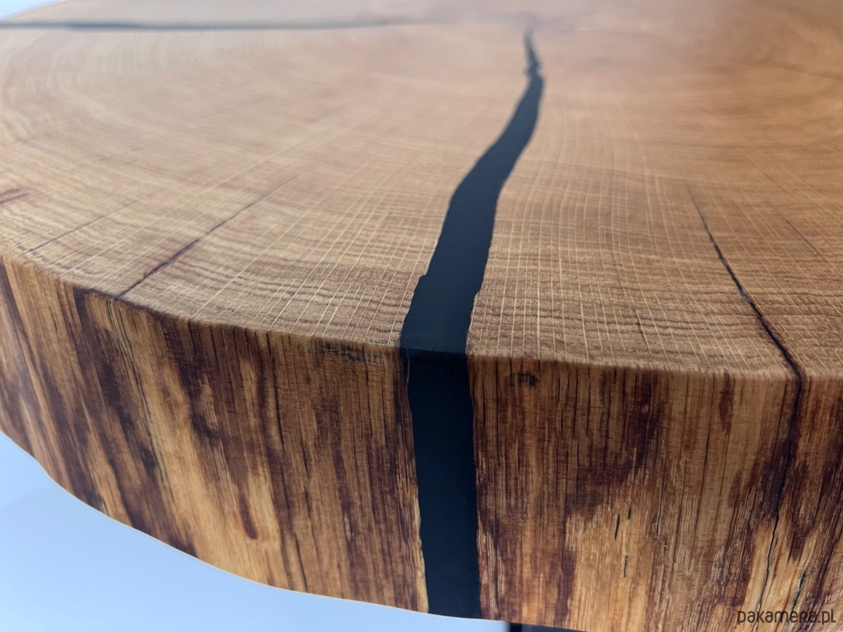 Ręcznie wykonany stolik dębowy łączący naturalny charakter litego drewna z nowoczesną, minimalistyczną stalą. Blat powstał z litego, selekcjonowanego dębu, a jego naturalne szczeliny zostały wypełnione czarną, matową żywicą epoksydową, która nadaje całości elegancji.