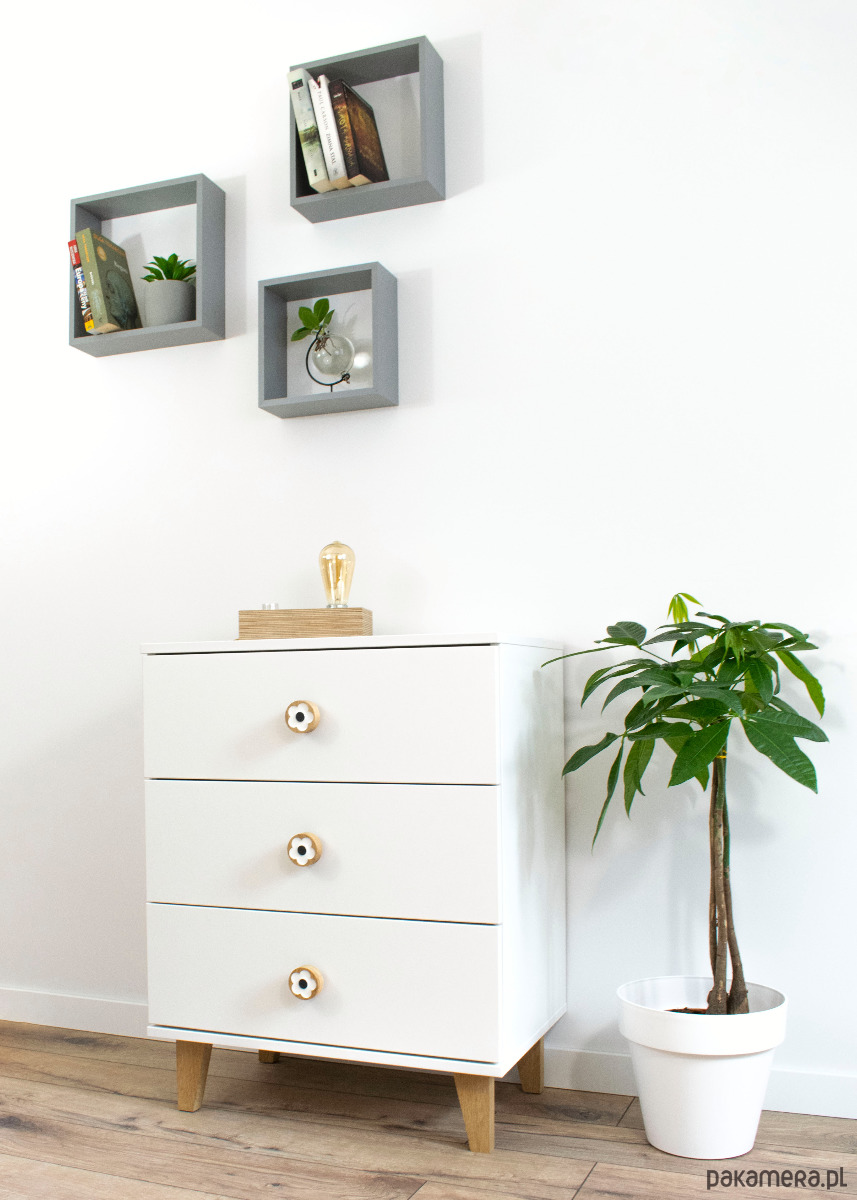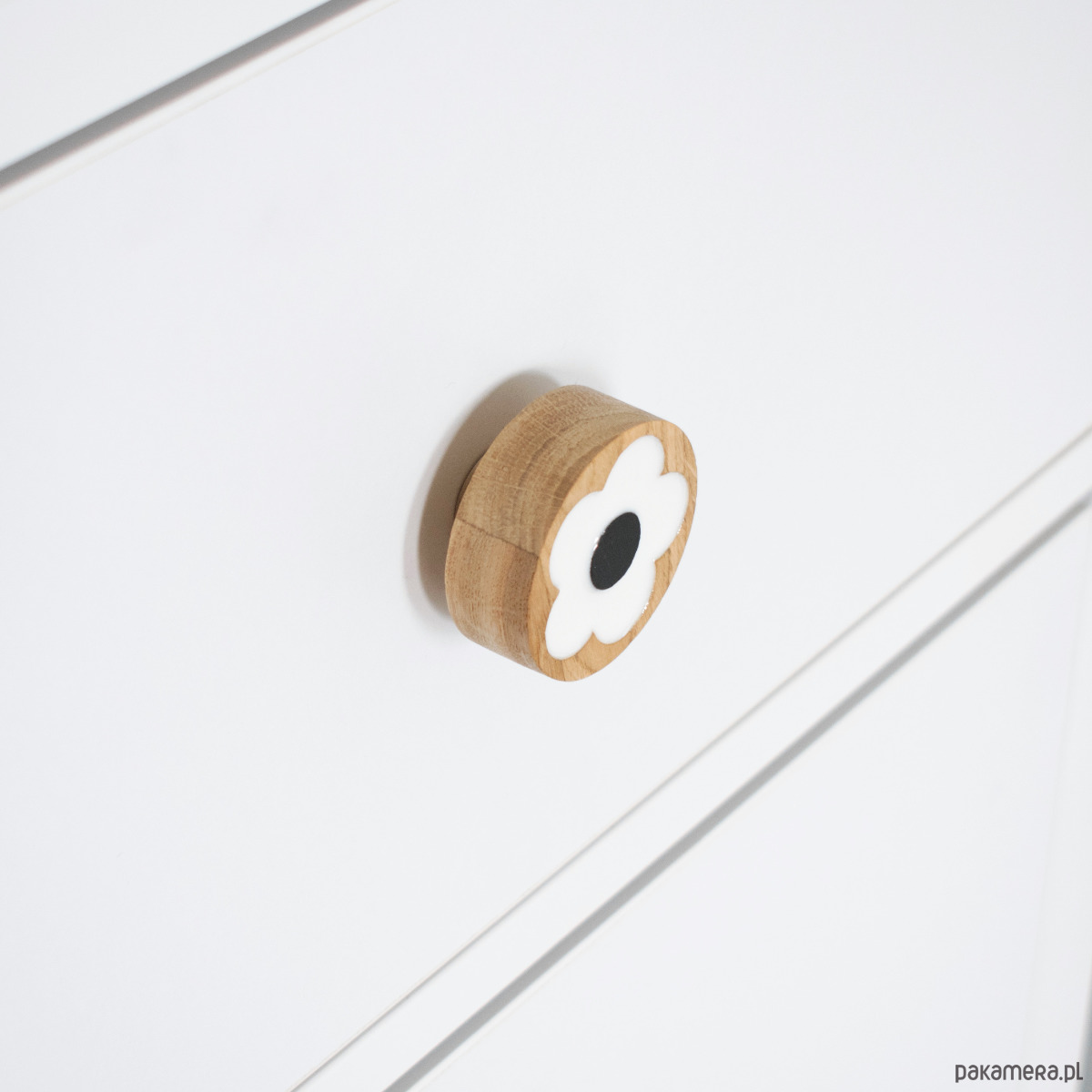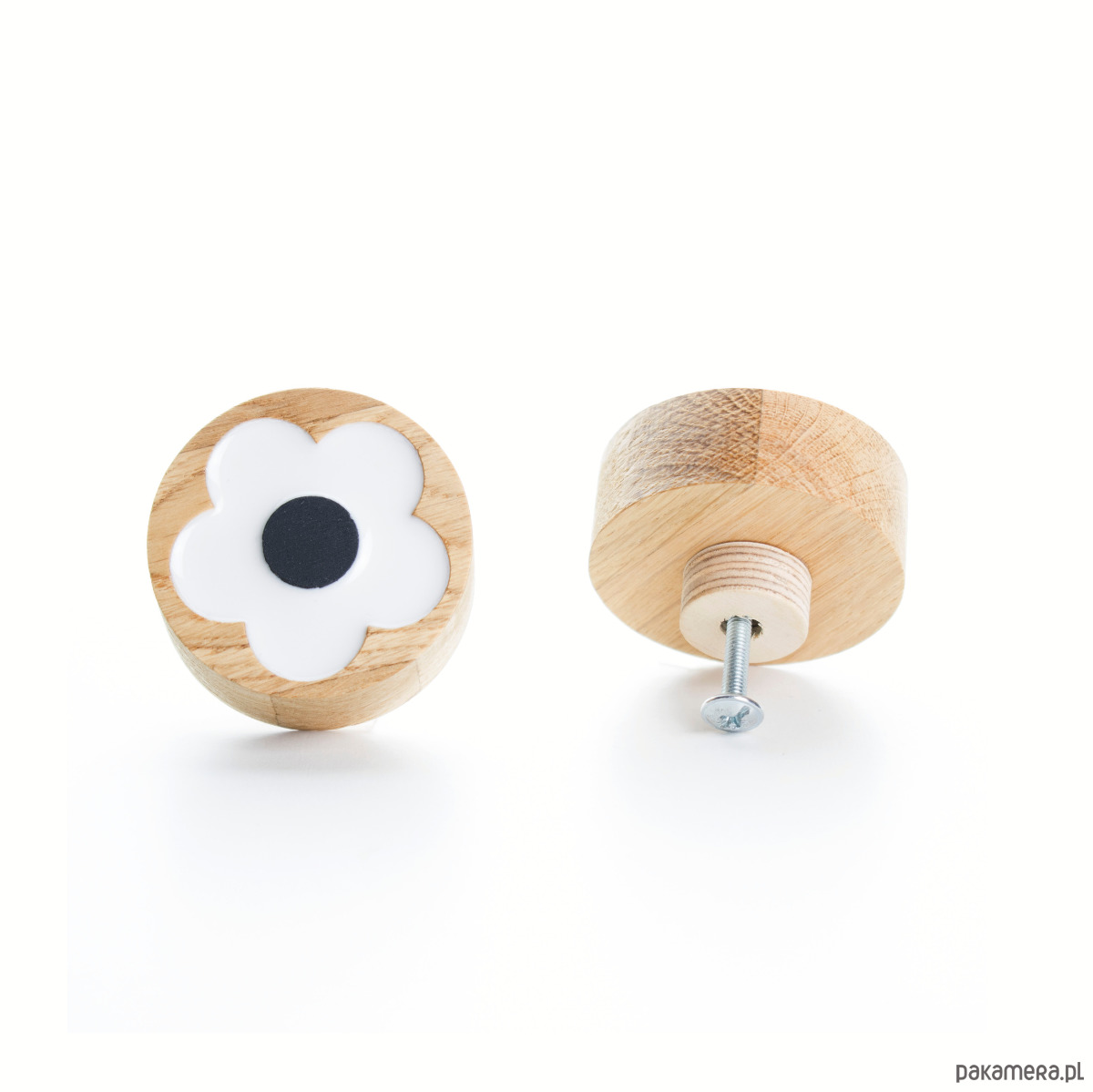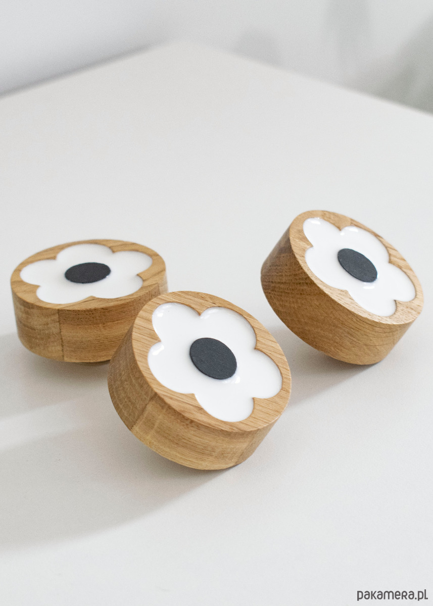 Dębowy uchwyt meblowy kwiat biały z czarnym środkiem