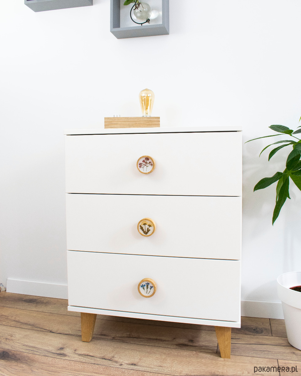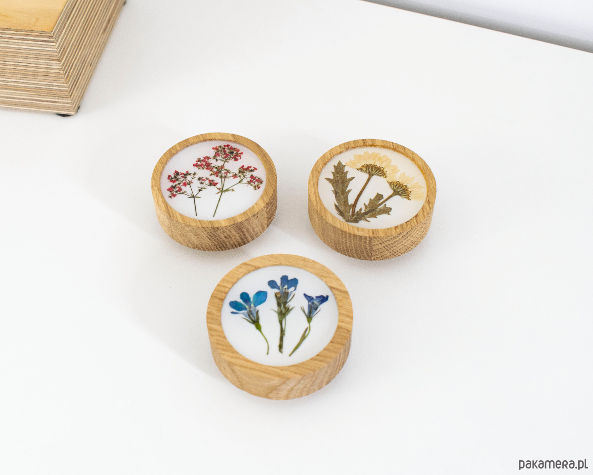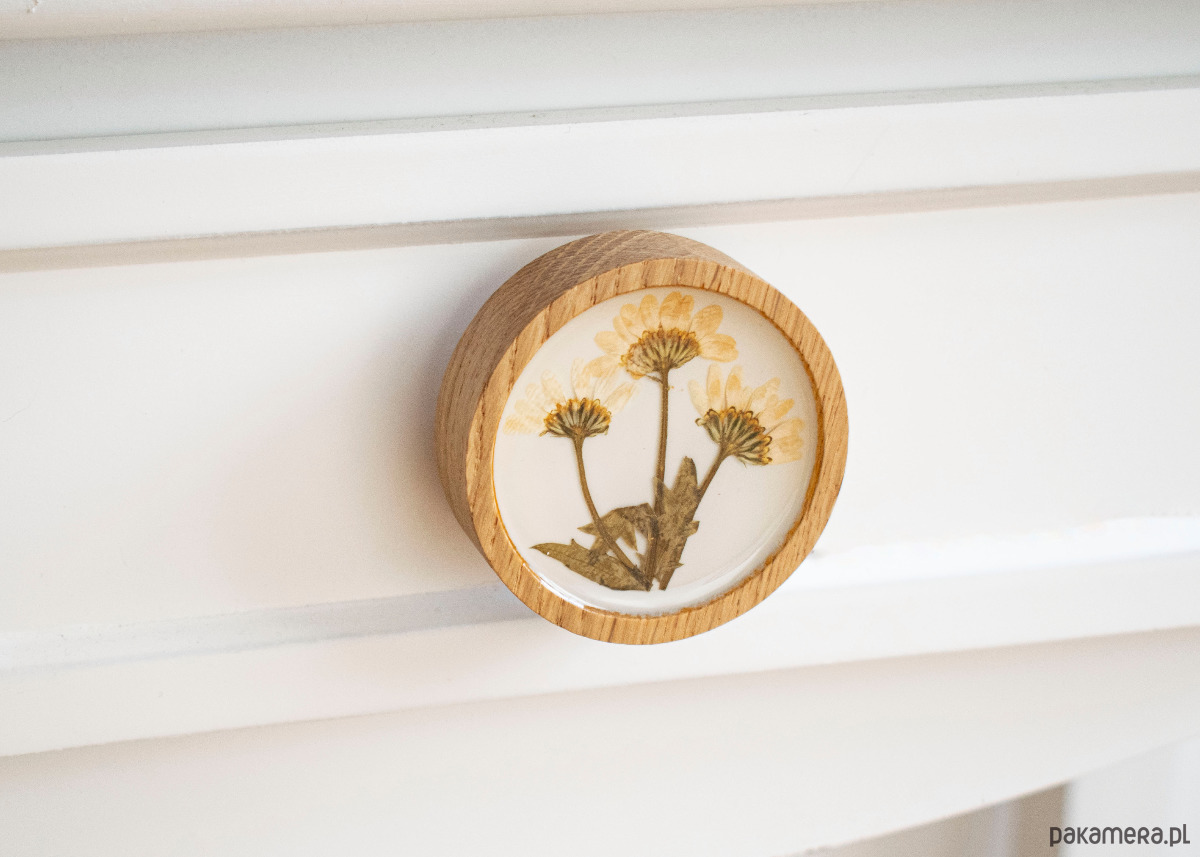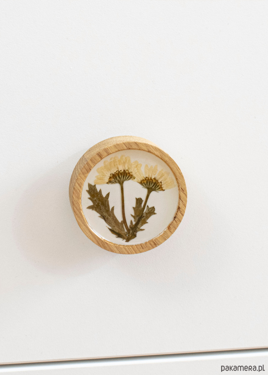 Uchwyt meblowy wykonany z drewna dębowego i suszonych kwiatów zatopionych w żywicy epoksydowej.