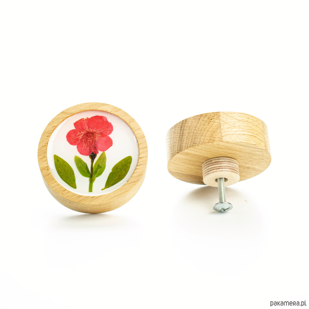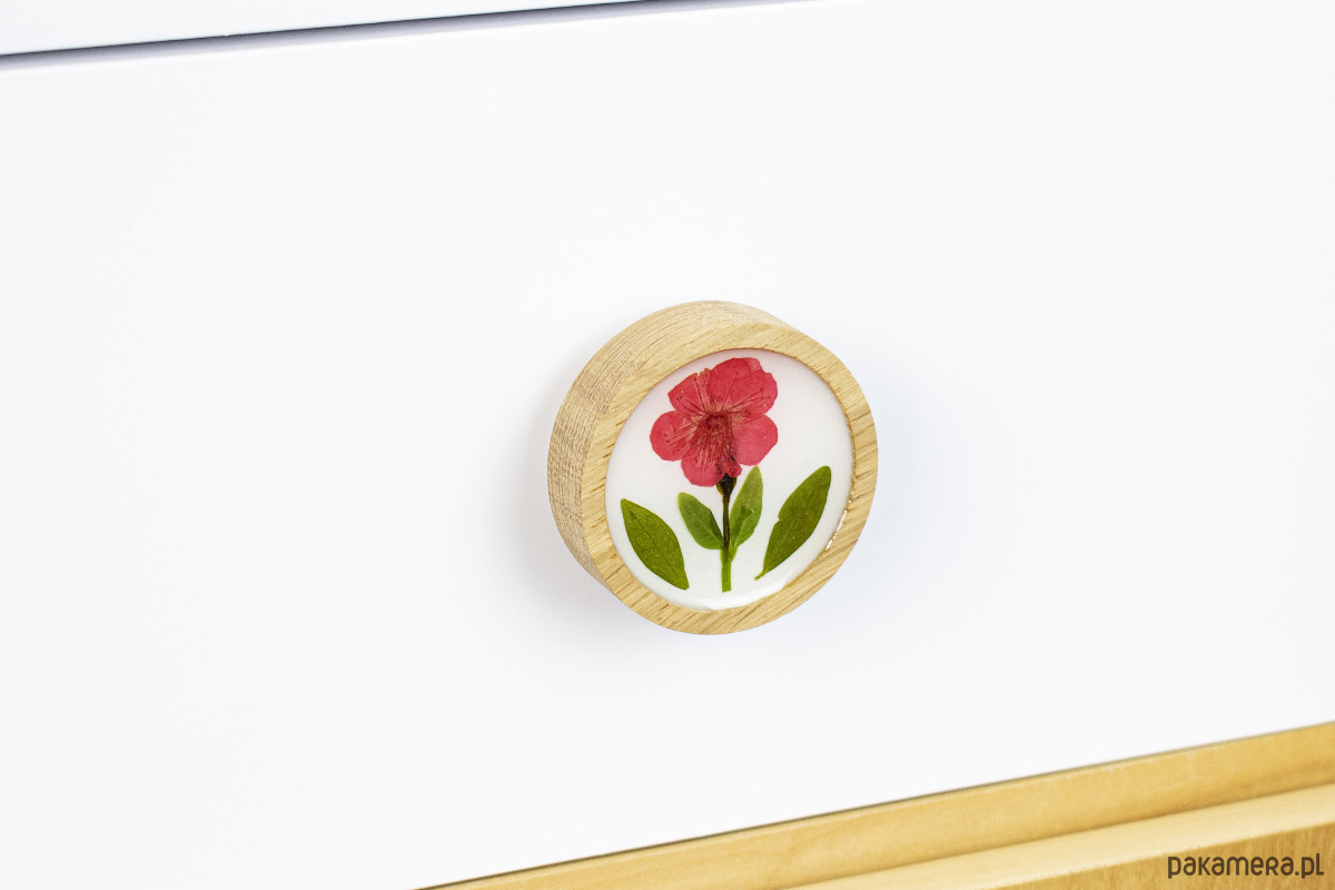 Dębowy uchwyt meblowy z czerwonym kwiatem