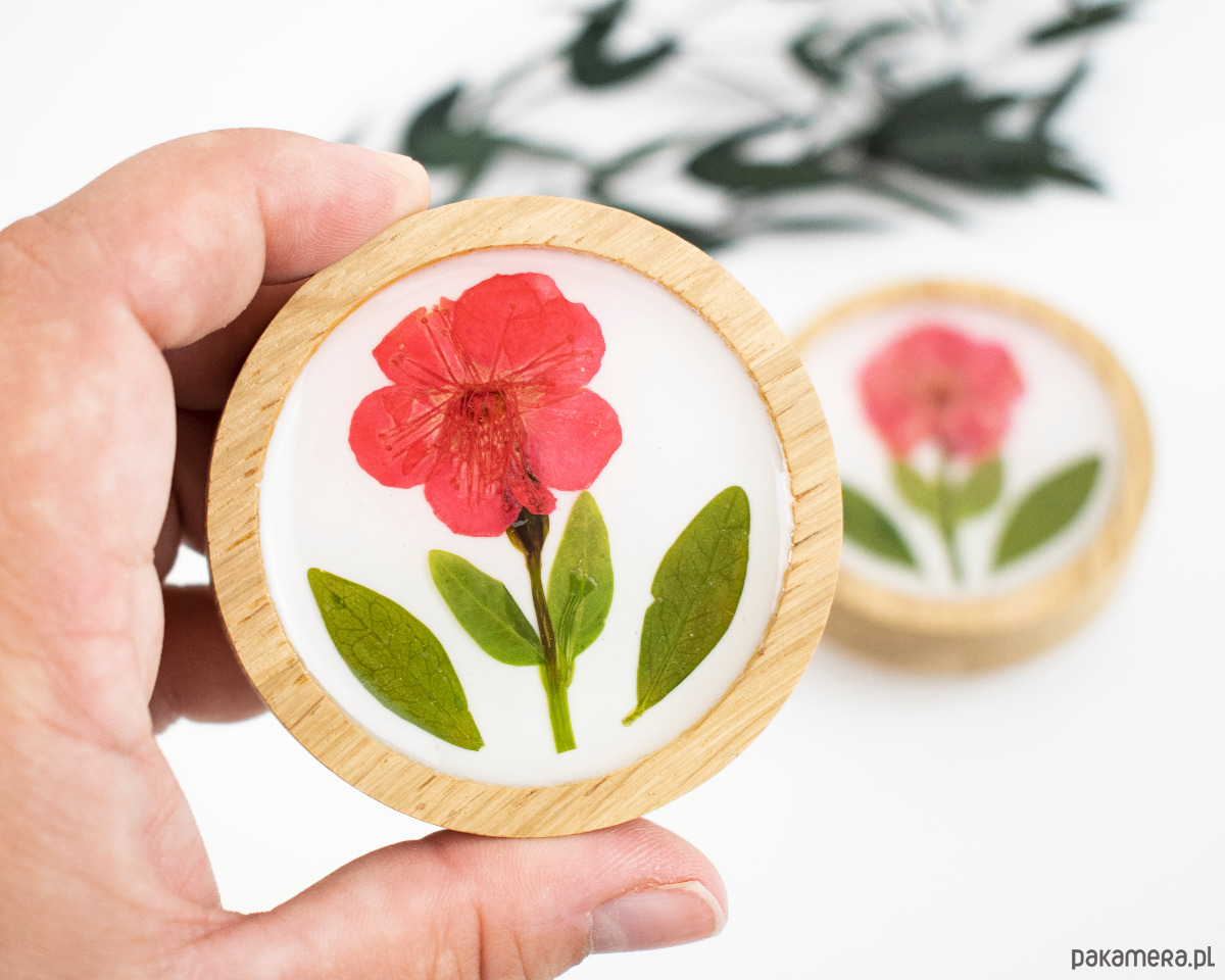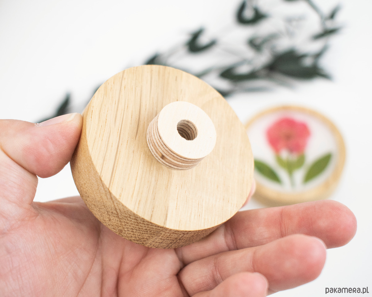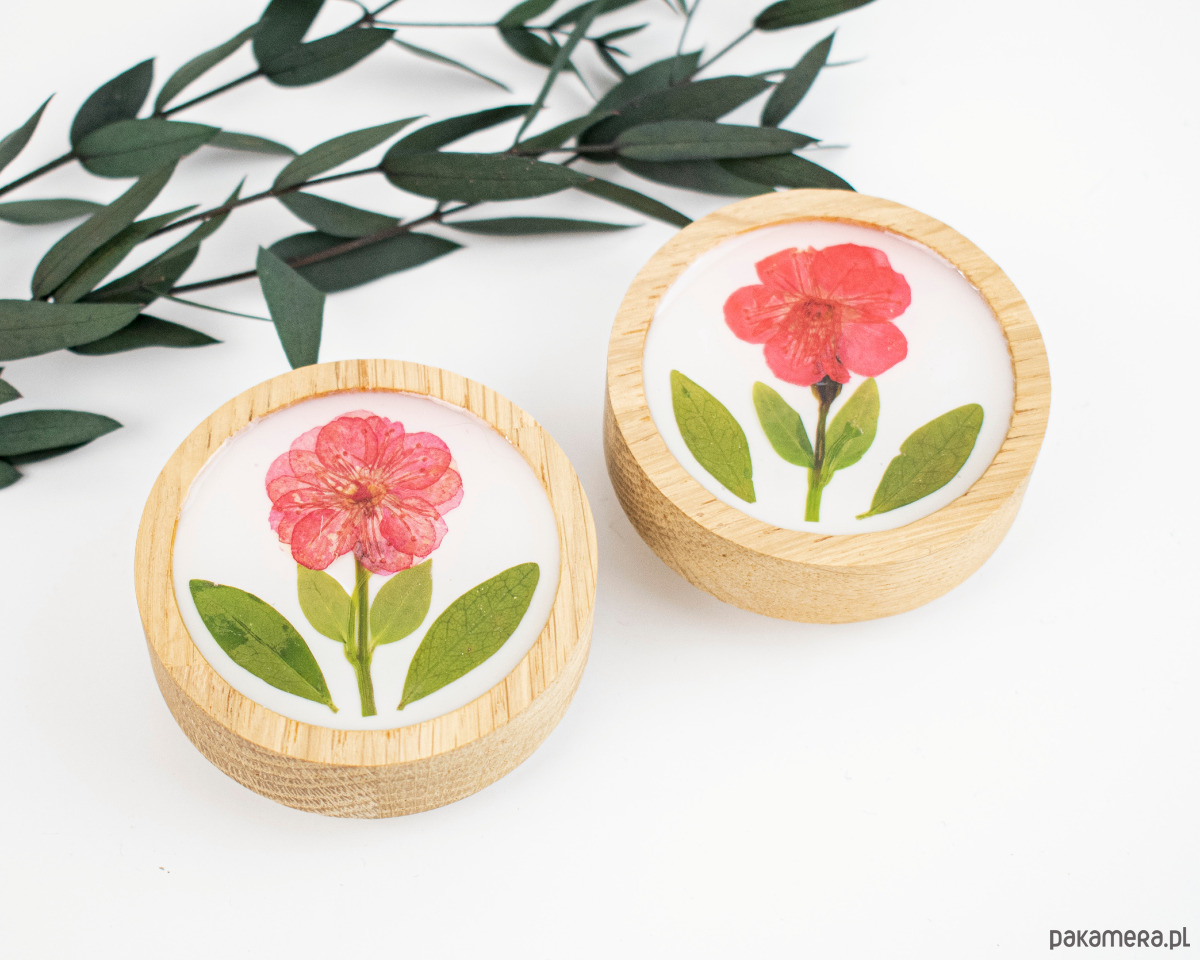 Uchwyt meblowy wykonany z drewna dębowego i suszonych kwiatów zatopionych w żywicy epoksydowej.