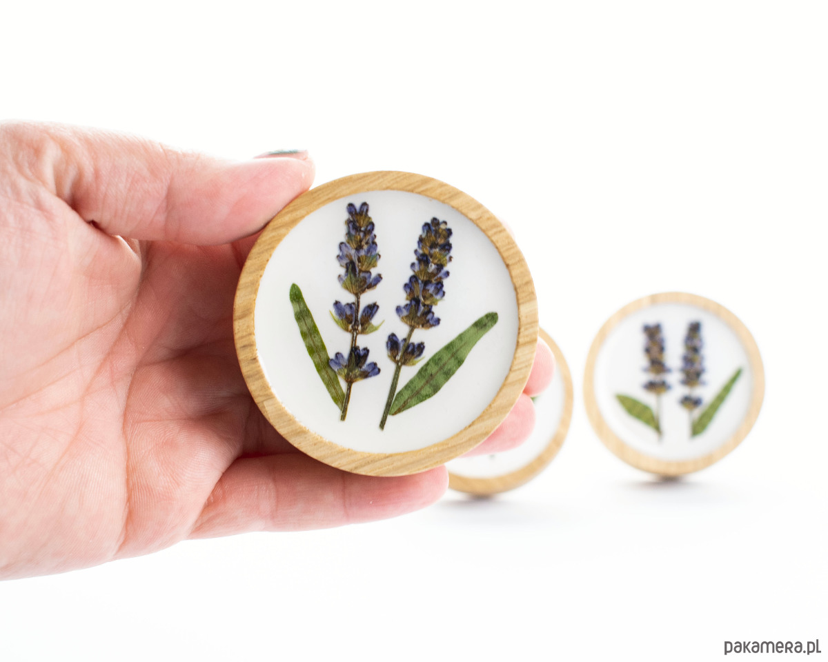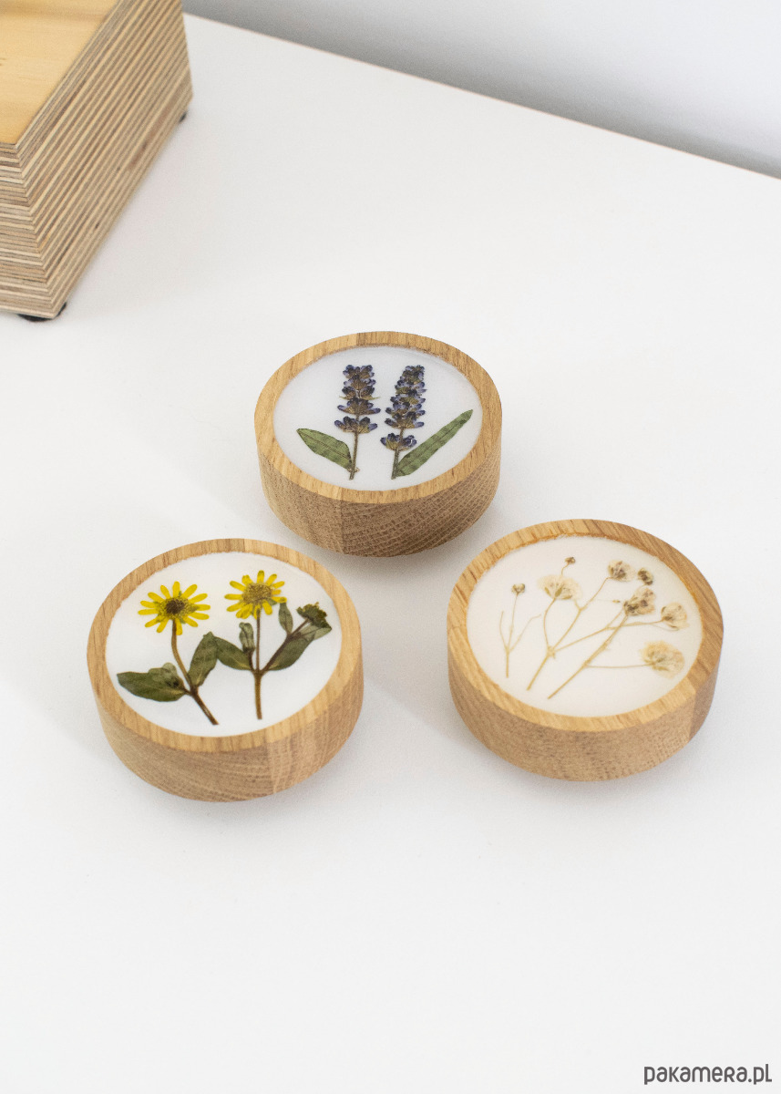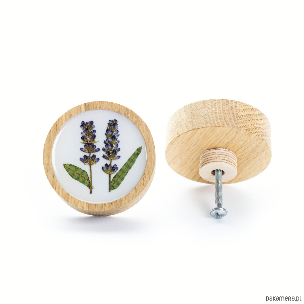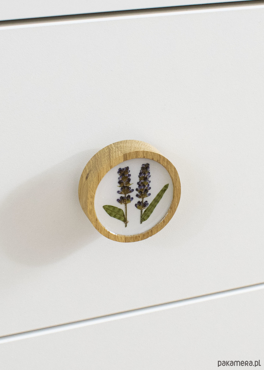 Uchwyt meblowy wykonany z drewna dębowego i suszonych kwiatów zatopionych w żywicy epoksydowej.