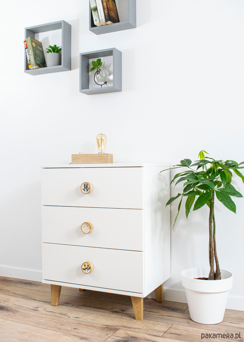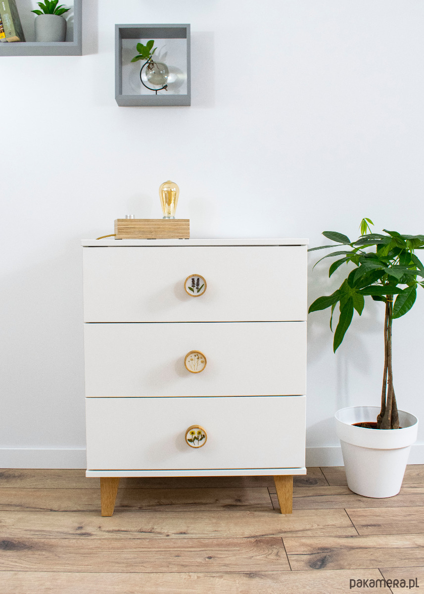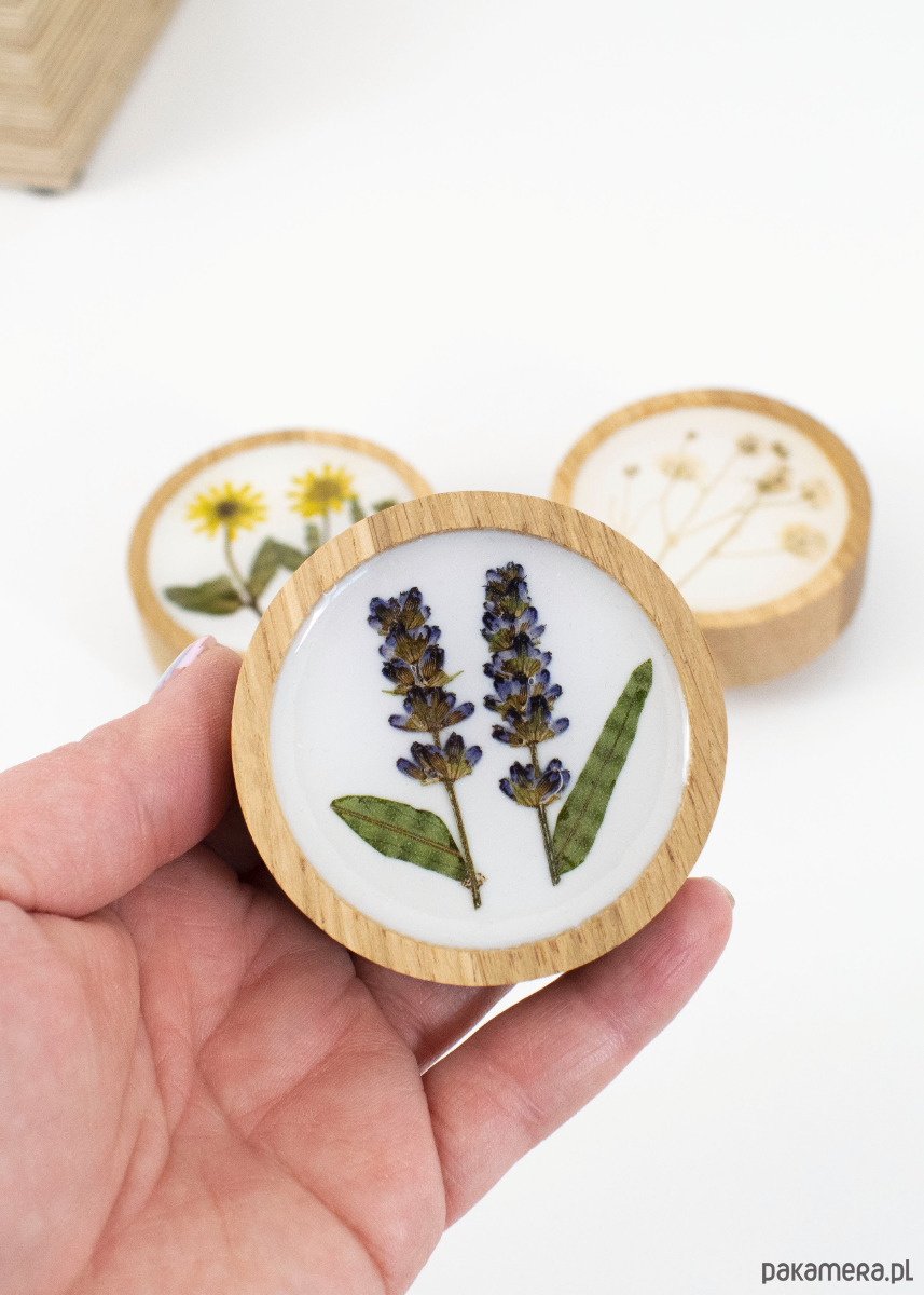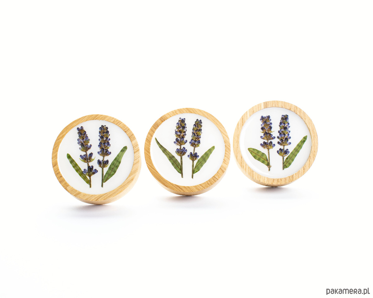 Uchwyt meblowy wykonany z drewna dębowego i suszonych kwiatów zatopionych w żywicy epoksydowej.