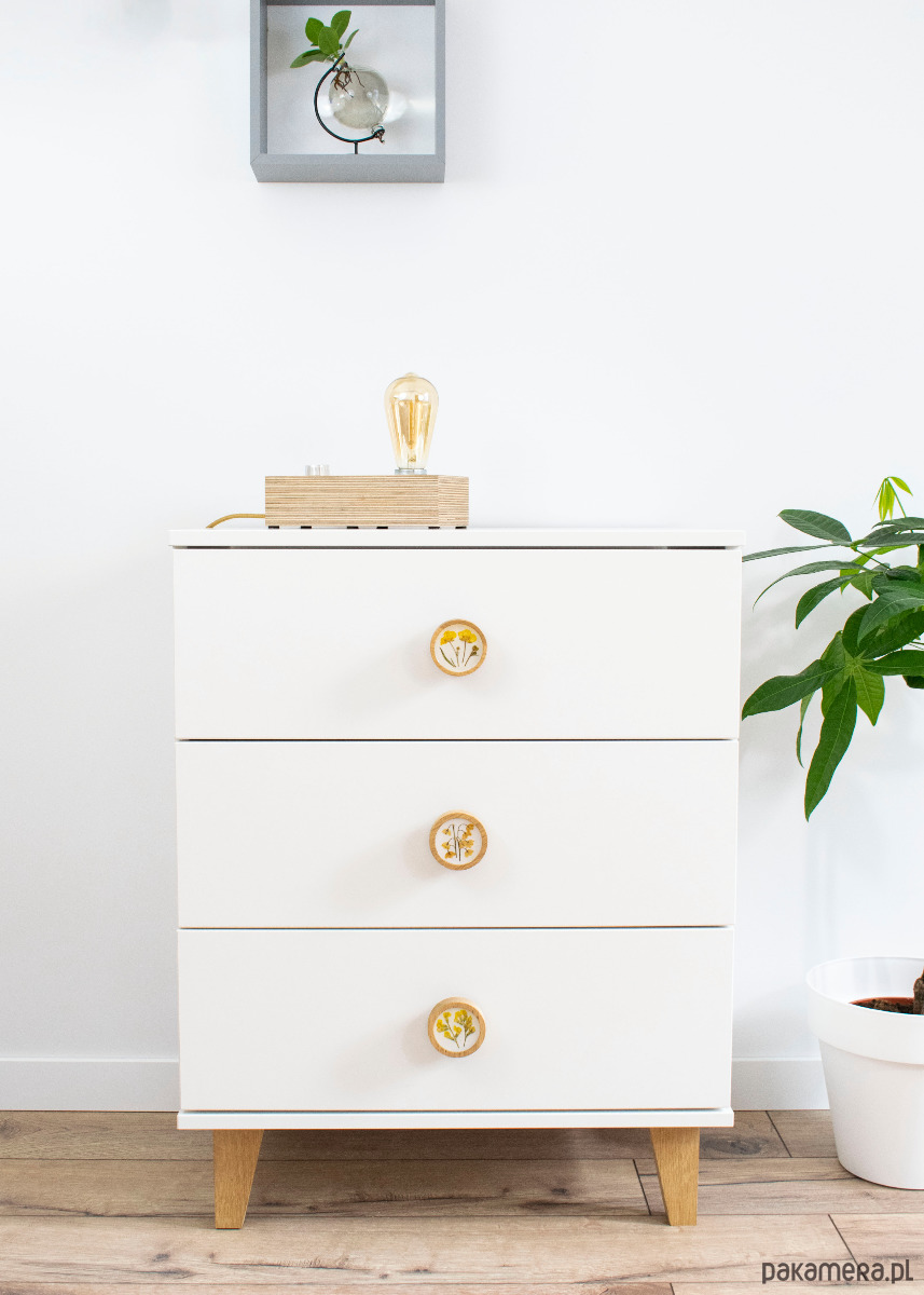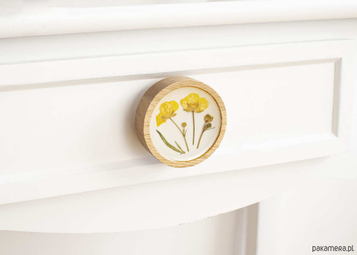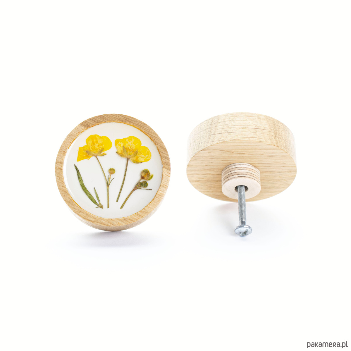 Dębowy uchwyt meblowy z żółtymi kwiatkami