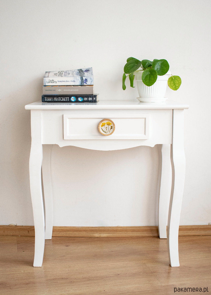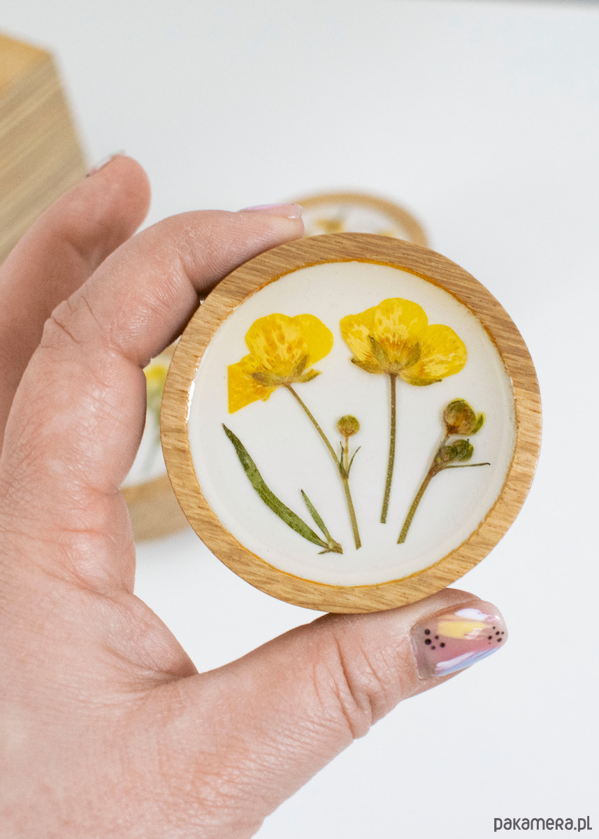 Uchwyt meblowy wykonany z drewna dębowego i suszonych kwiatów zatopionych w żywicy epoksydowej.