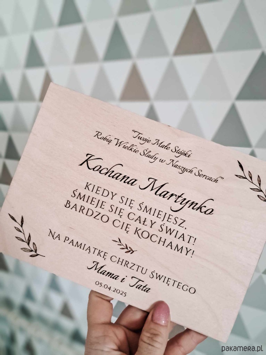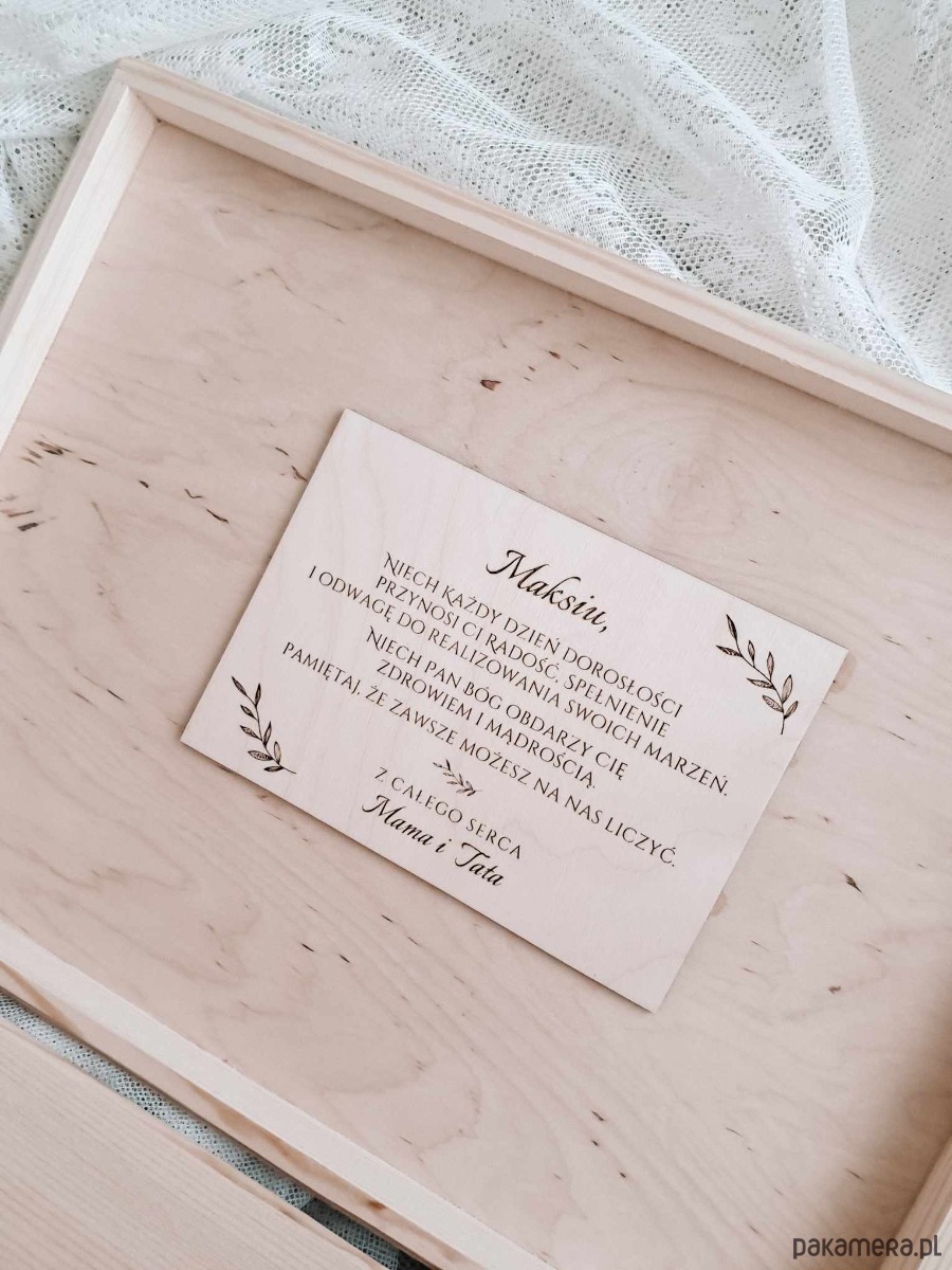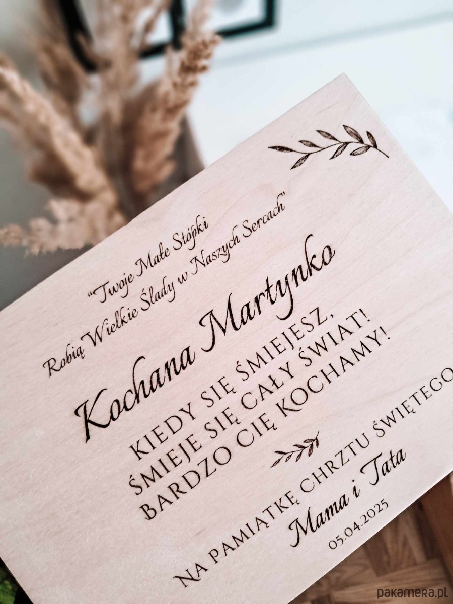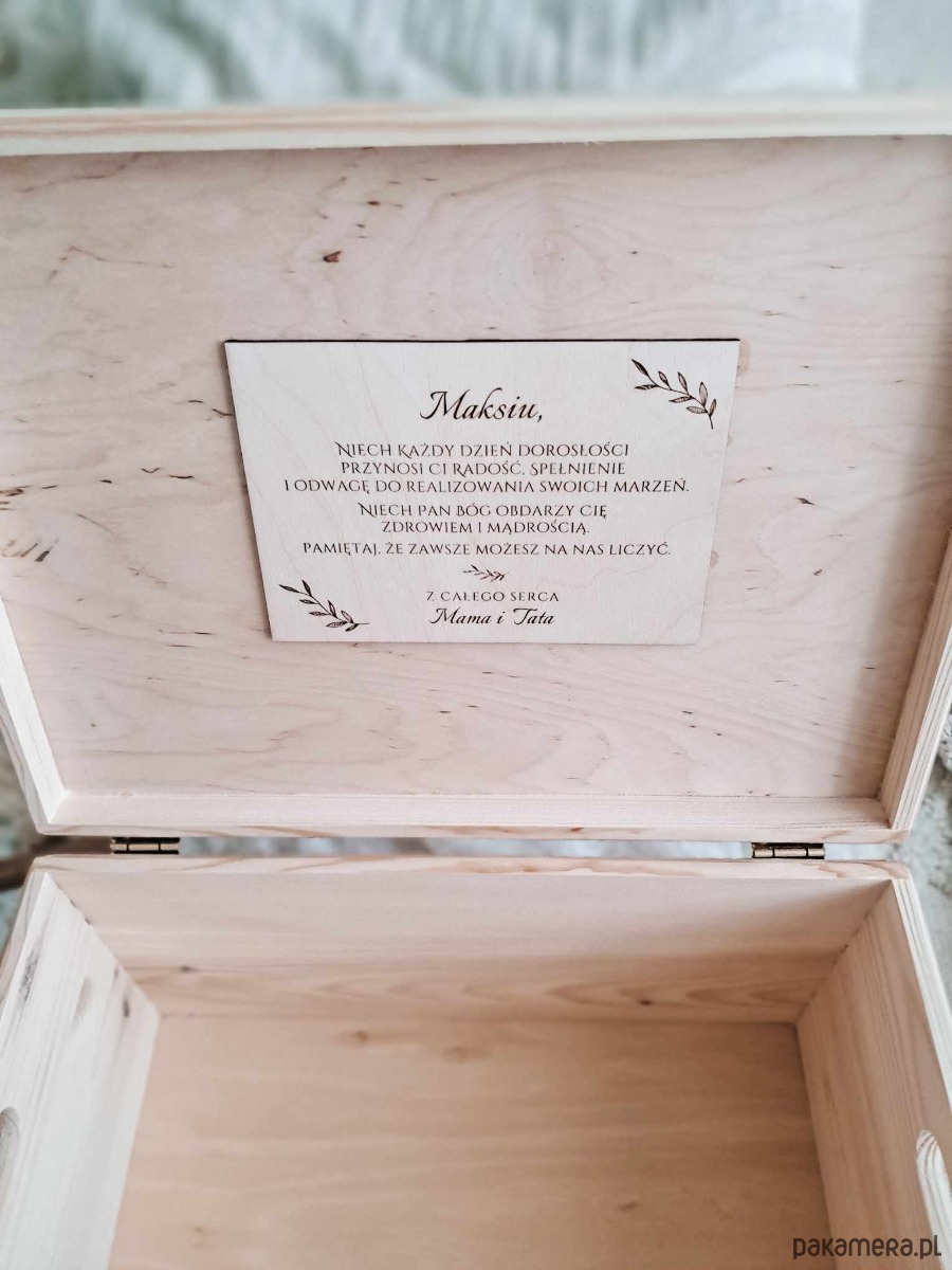 Przedstawiamy wyjątkowy dodatek do naszych drewnianych kuferków wspomnień – personalizowaną dedykację umieszczoną wewnątrz pudełka, która nada prezentowi szczególny i osobisty charakter, czyniąc go piękną pamiątką ważnego wydarzenia.