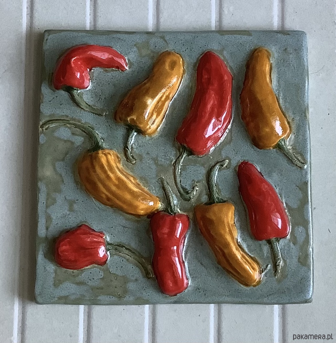 Płytka ceramiczna ok. 16 x 16 cm z motywem selera naciowego, trójwymiarowa - jedna z dużych z serii VEGEDECORS. Wykonane metodą odcisku i wykończone ręcznie. Wysokość (z motywem) ok. 4 cm. Wypalana dwukrotnie, szkliwiona. Z tyłu posiada otwór - można go zawiesić na ścianie. Jest odporny na temperaturę i ścieranie. Może stanowić piękną ozdobę kuchni, salonu.