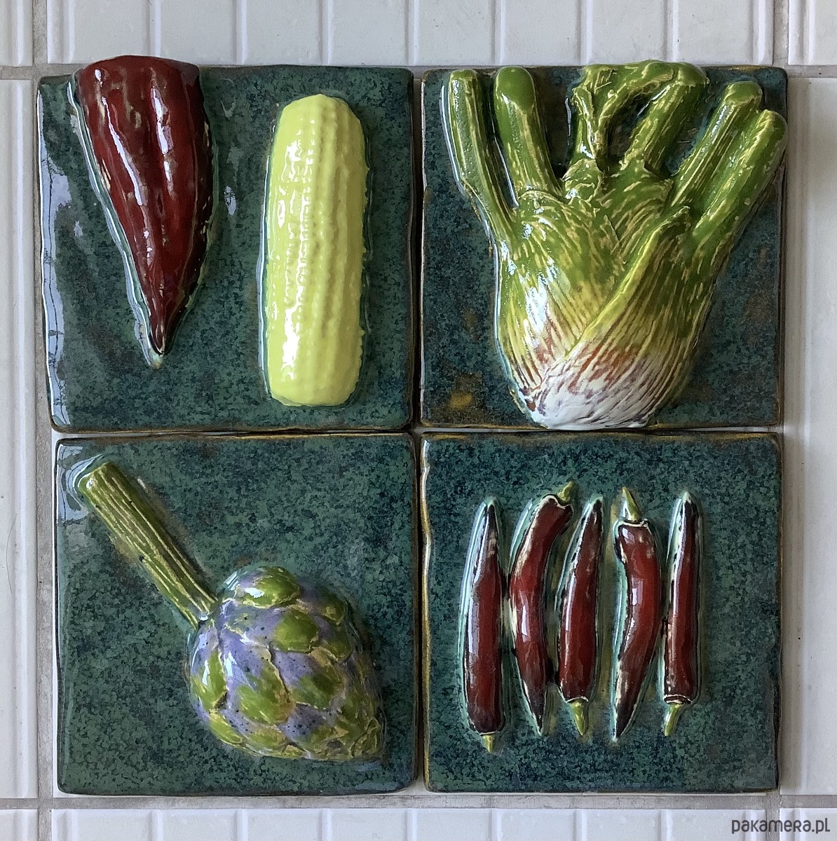 Płytka ceramiczna ok. 16 x 16 cm z motywem selera naciowego, trójwymiarowa - jedna z dużych z serii VEGEDECORS. Wykonane metodą odcisku i wykończone ręcznie. Wysokość (z motywem) ok. 4 cm. Wypalana dwukrotnie, szkliwiona. Z tyłu posiada otwór - można go zawiesić na ścianie. Jest odporny na temperaturę i ścieranie. Może stanowić piękną ozdobę kuchni, salonu.