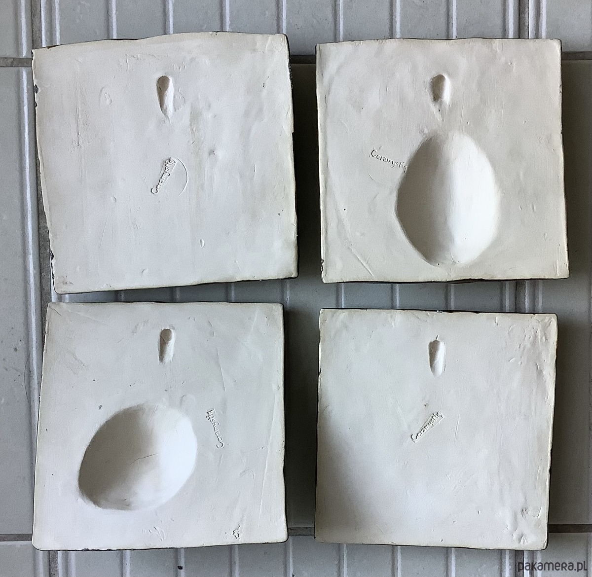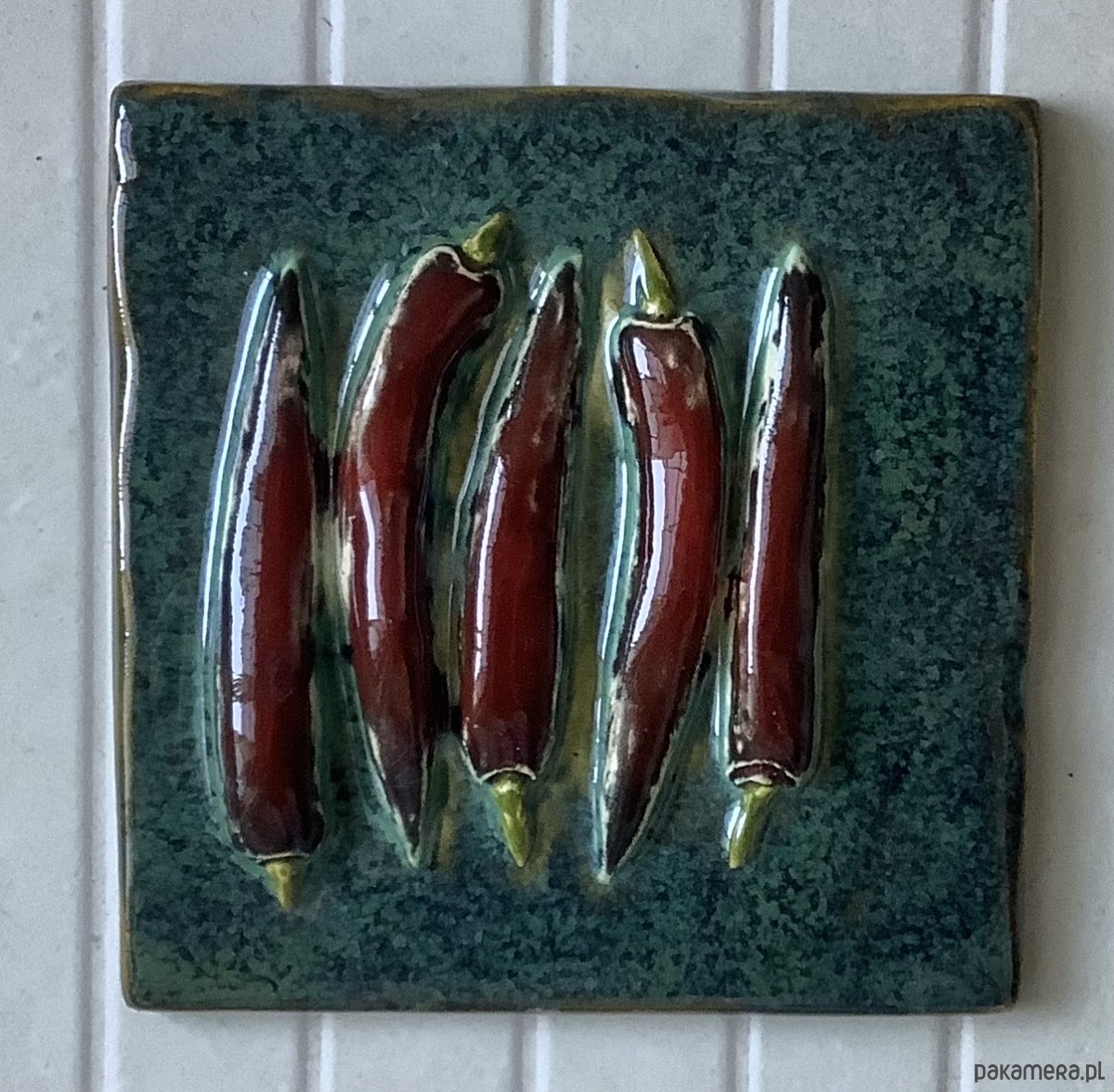 Płytka ceramiczna ok. 16 x 16 cm z motywem selera naciowego, trójwymiarowa - jedna z dużych z serii VEGEDECORS. Wykonane metodą odcisku i wykończone ręcznie. Wysokość (z motywem) ok. 4 cm. Wypalana dwukrotnie, szkliwiona. Z tyłu posiada otwór - można go zawiesić na ścianie. Jest odporny na temperaturę i ścieranie. Może stanowić piękną ozdobę kuchni, salonu.