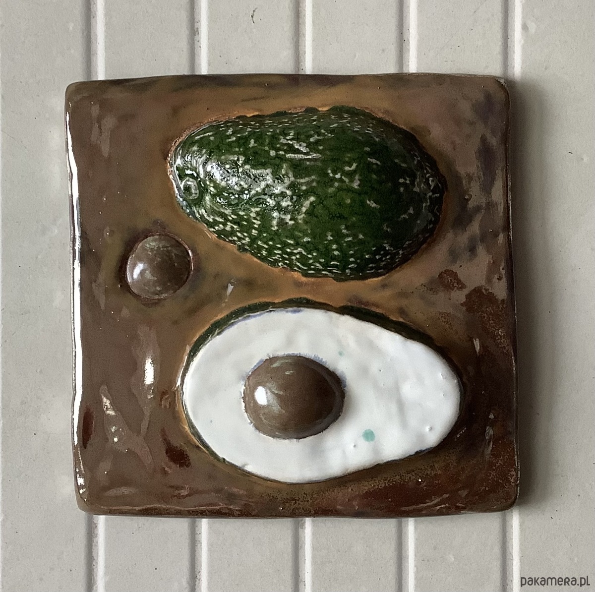Płytka ceramiczna ok. 16 x 16 cm z motywem awokado, trójwymiarowa - jedna z dużych z serii VEGEDECORS. Wykonane metodą odcisku i wykończone ręcznie. Wysokość (z motywem) ok. 4 cm. Wypalana dwukrotnie, szkliwiona. Z tyłu posiada otwór - można go zawiesić na ścianie. Jest odporny na temperaturę i ścieranie. Może stanowić piękną ozdobę kuchni, salonu.