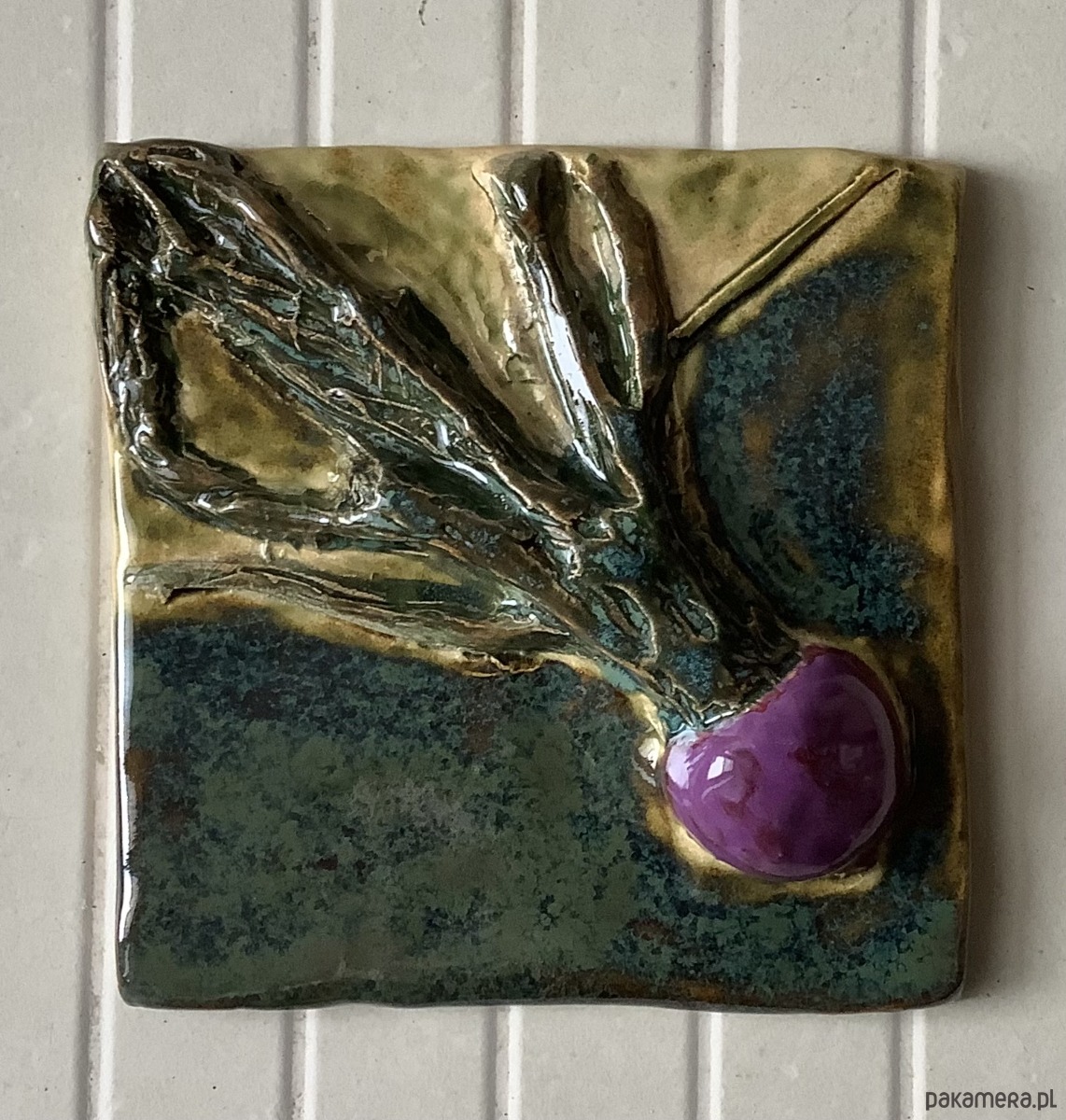 Płytka ceramiczna ok. 16 x 16 cm z motywem czerwonego buraczka, trójwymiarowa - jedna z dużych z serii VEGEDECORS. Wykonane metodą odcisku i wykończone ręcznie. Wysokość (z motywem) ok. 4 cm. Wypalana dwukrotnie, szkliwiona. Z tyłu posiada otwór - można go zawiesić na ścianie. Jest odporny na temperaturę i ścieranie. Może stanowić piękną ozdobę kuchni, salonu.