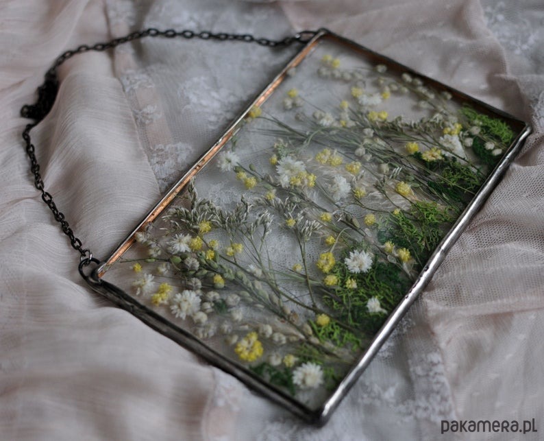 W szkle umieszczone są prawdziwe, suszone kwiaty w rozmaitych kolorach.