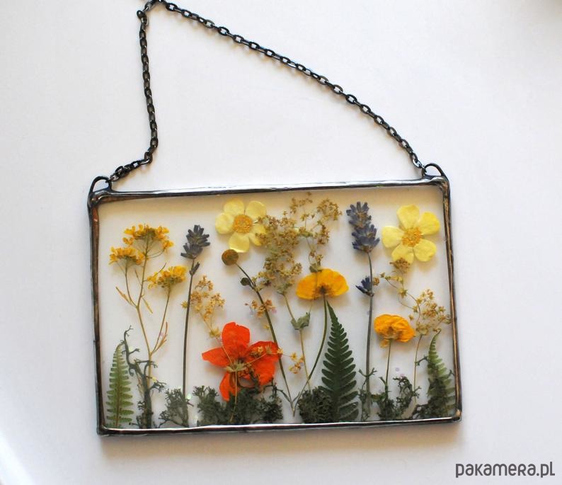 W szkle umieszczone są prawdziwe, suszone kwiaty w rozmaitych kolorach.