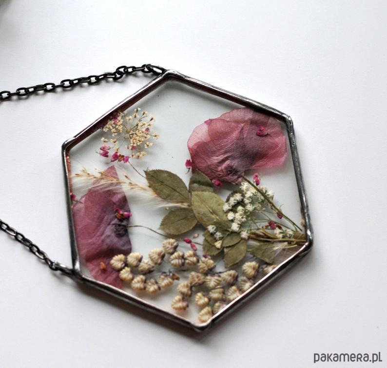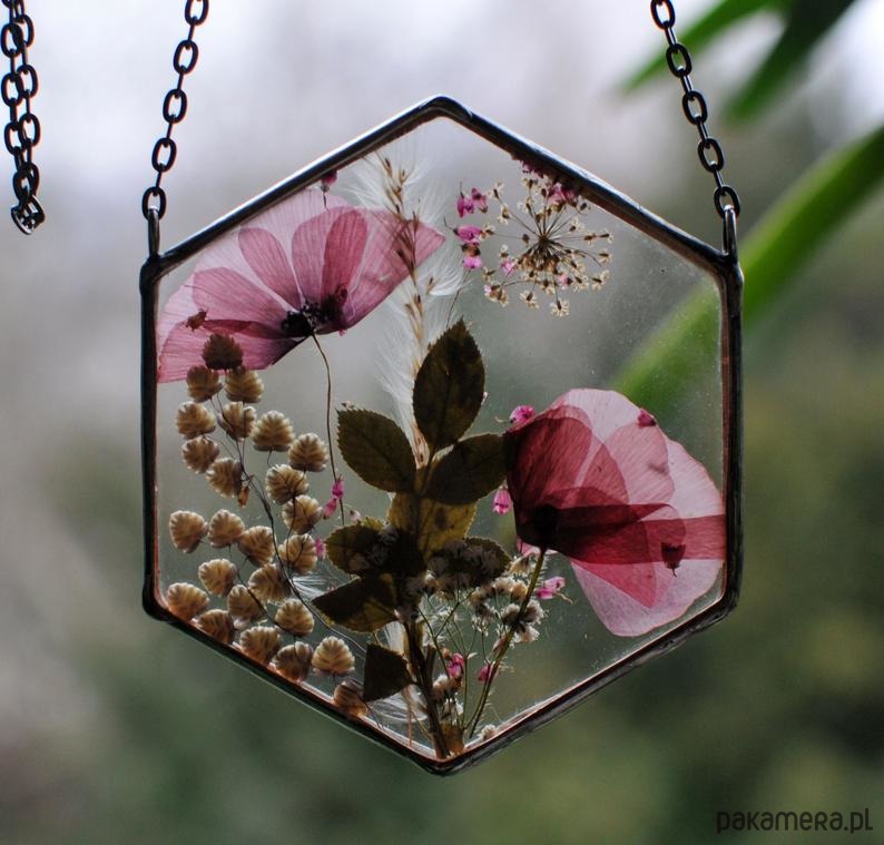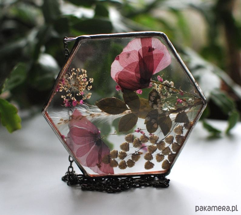 W szkle umieszczone są prawdziwe, suszone kwiaty.
