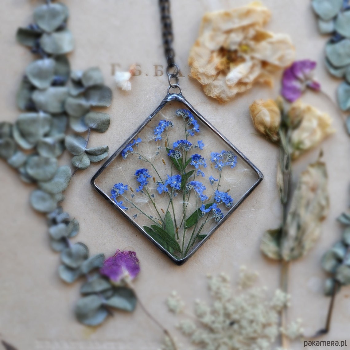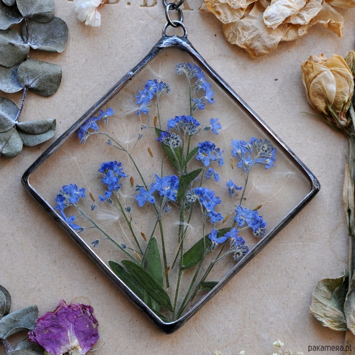 W szkle umieszczone są prawdziwe, suszone kwiaty.
