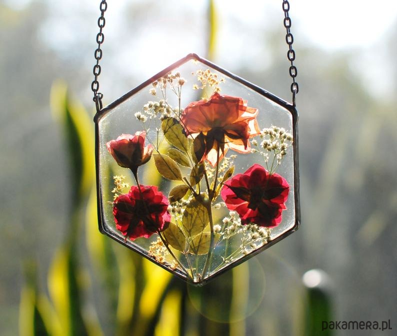 W sześciokątnym szkle umieszczone są prawdziwe, suszone kwiaty róż i gipsówki.