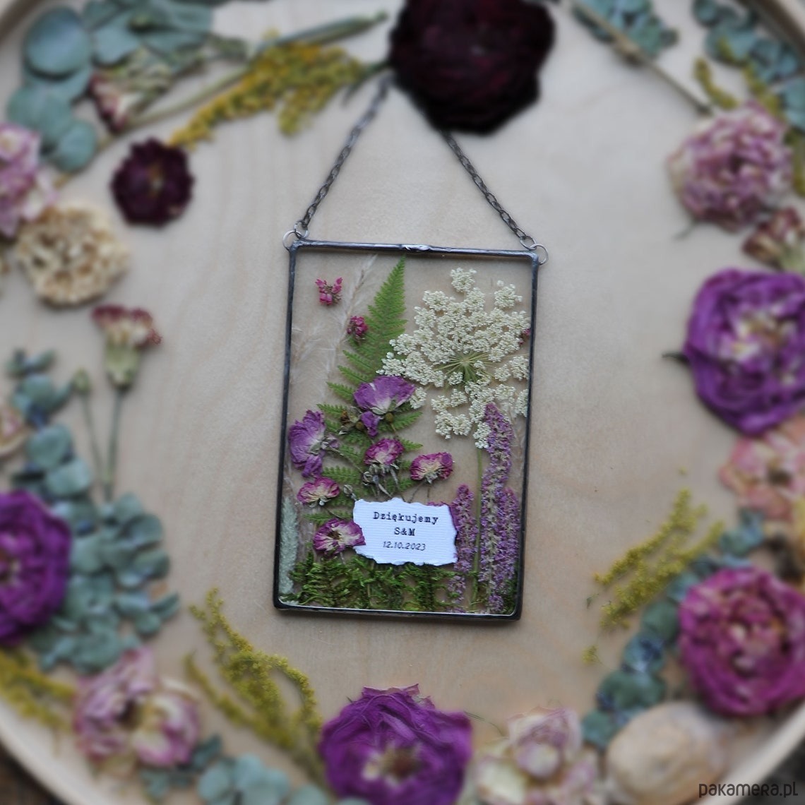 Dekoracyjny witraż z kompozycją z suszonych roślin wykonany w całości w pracowni rękodzieła MARIAELA. Prezent z klasą.