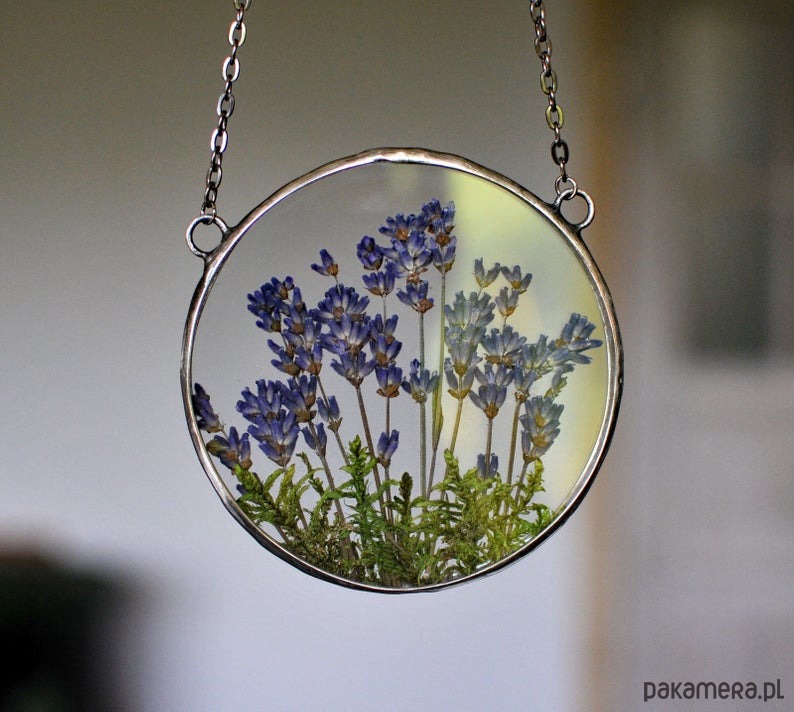 W szkle umieszczone są prawdziwe, suszone kwiaty lawendy.