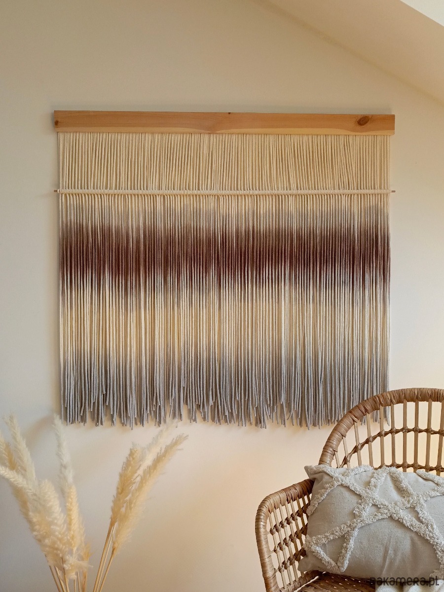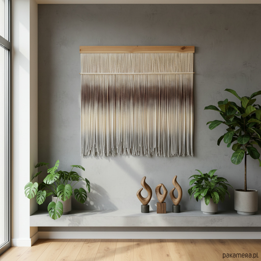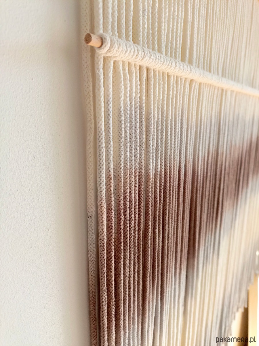 Minimalistyczna, a zarazem wyrazista makrama wnosi harmonię, fakturę i nowoczesny akcent boho do każdego dużego salonu. Każdy sznur został starannie ułożony i ręcznie farbowany, nadając dekoracji niepowtarzalny charakter. Idealnie sprawdzi się w salonie, sypialni lub biurze, łącząc się z naturalnymi materiałami i nowoczesnymi dodatkami.