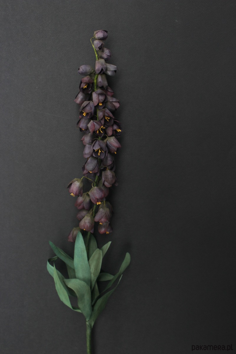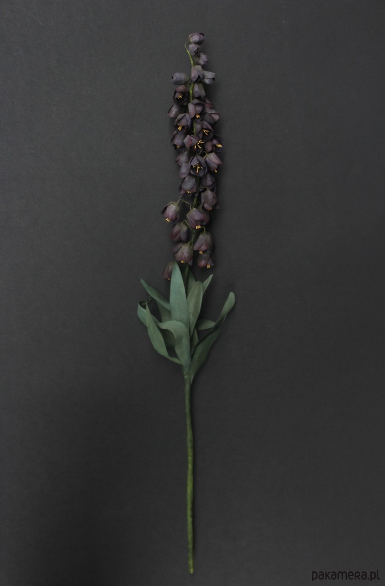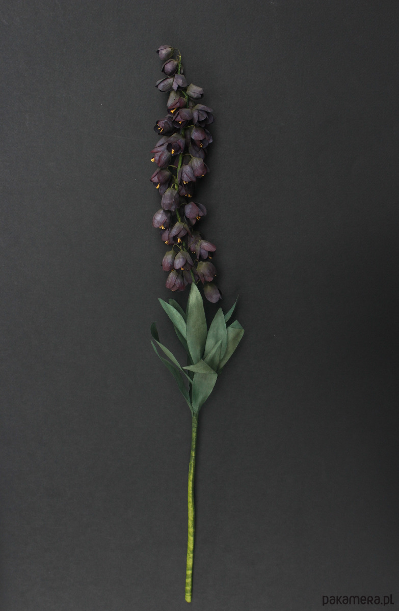 Szachownica wykonana jest ręcznie z wysokiej jakości włoskiej krepiny. Każdy płatek został osobno pomalowany i uformowany, żeby w efekcie stworzyć cały kwiatostan składający się z wielu drobnych elementów. Ciemne odcienie, które tak rzadko pojawiają się w świecie roślin dodają jej wyjątkowości.