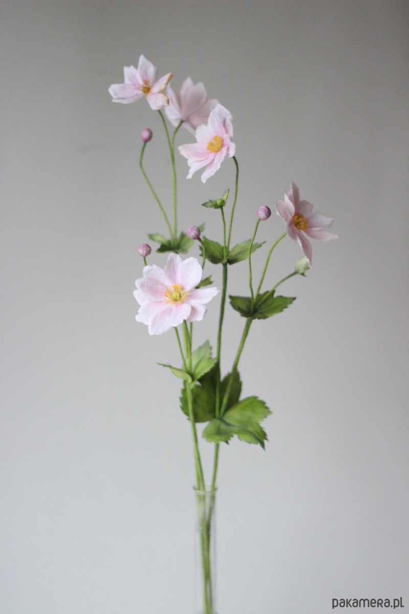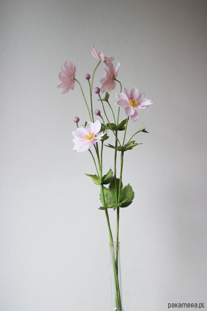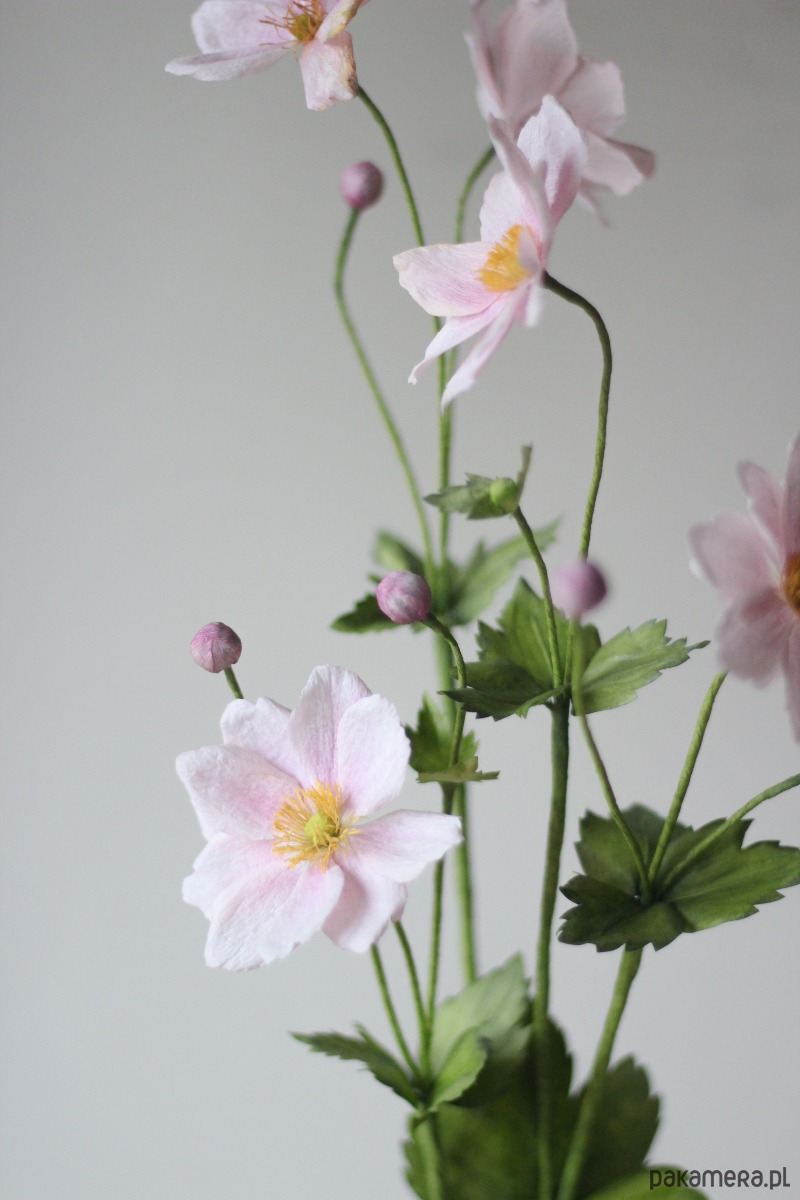 Zawilce wykonane są ręcznie z wysokiej jakości włoskiej krepiny. Każdy płatek został osobno przygotowany i uformowany, żeby w efekcie stworzyć cały kwiatostan. Trzy gałązki stworzone są z kwiatów w różnych fazach - od pełnego rozkwitu do najmniejszych, zamkniętych pączków. Uchwycony został też moment przekwitania. Gałązki są różnej wielkości i wysokości, żeby od razu po włożeniu do wazonu stworzyły piękną kompozycję.