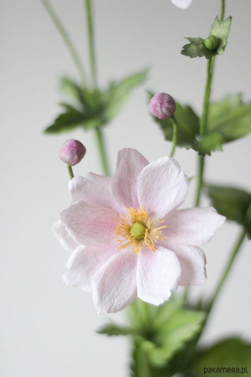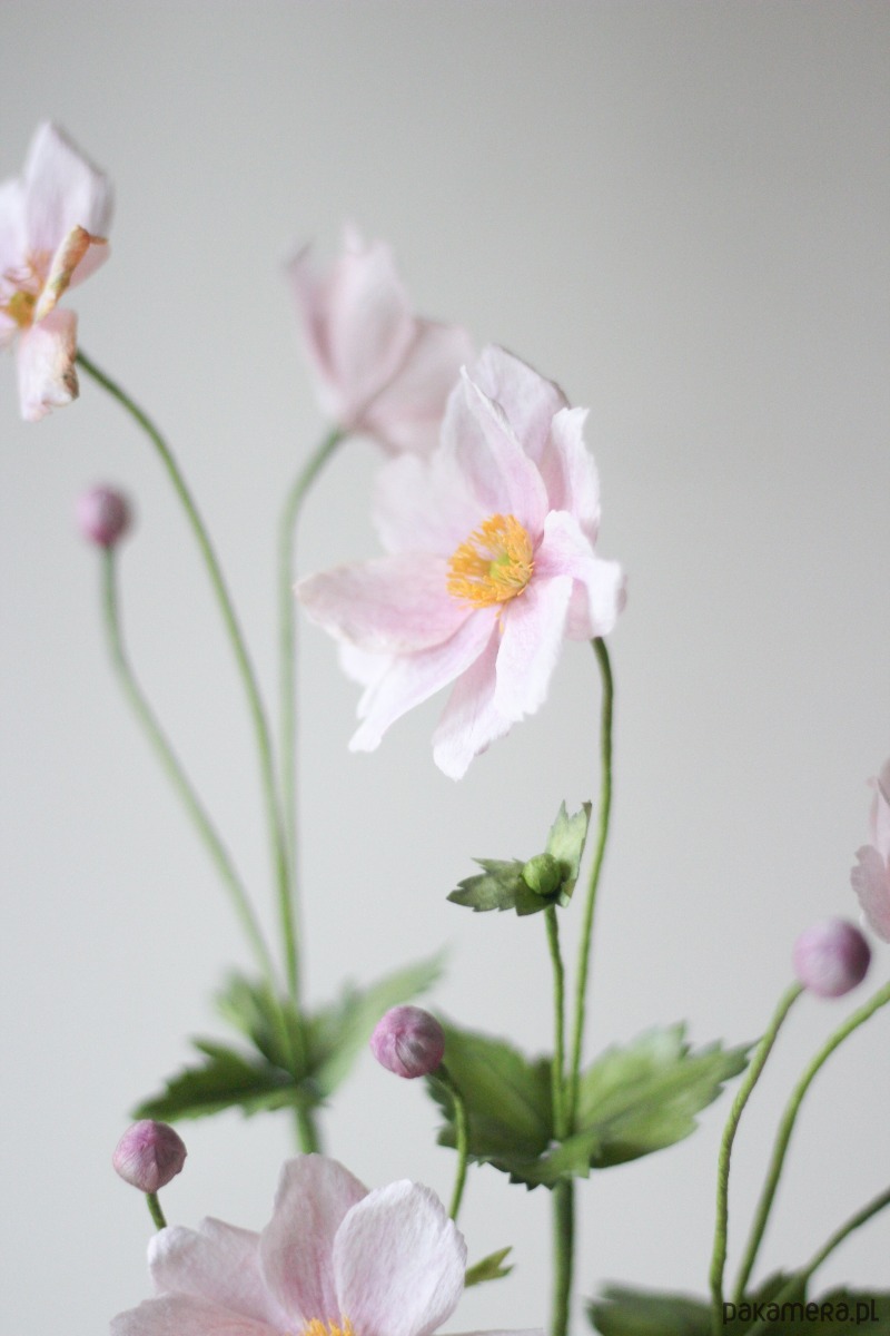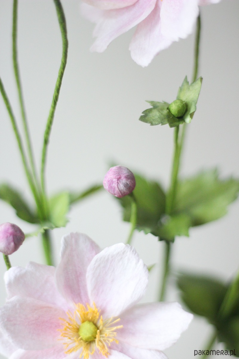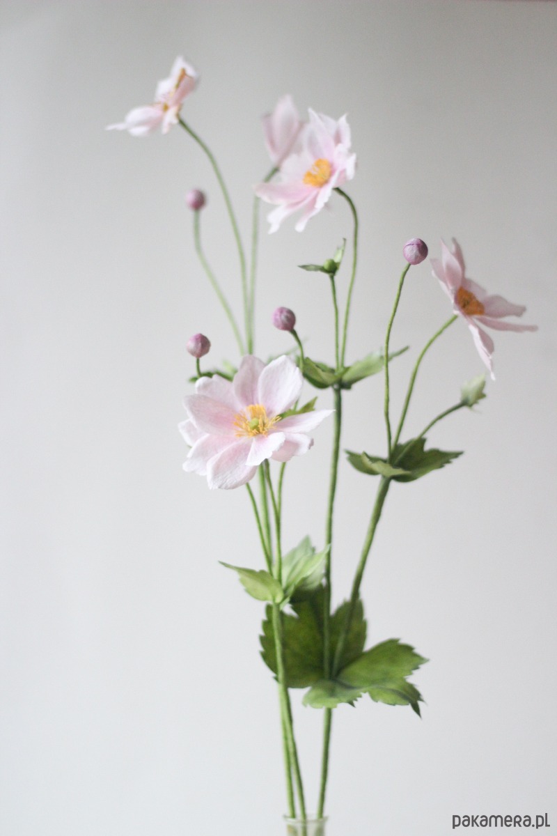 Zawilce wykonane są ręcznie z wysokiej jakości włoskiej krepiny. Każdy płatek został osobno przygotowany i uformowany, żeby w efekcie stworzyć cały kwiatostan. Trzy gałązki stworzone są z kwiatów w różnych fazach - od pełnego rozkwitu do najmniejszych, zamkniętych pączków. Uchwycony został też moment przekwitania. Gałązki są różnej wielkości i wysokości, żeby od razu po włożeniu do wazonu stworzyły piękną kompozycję.