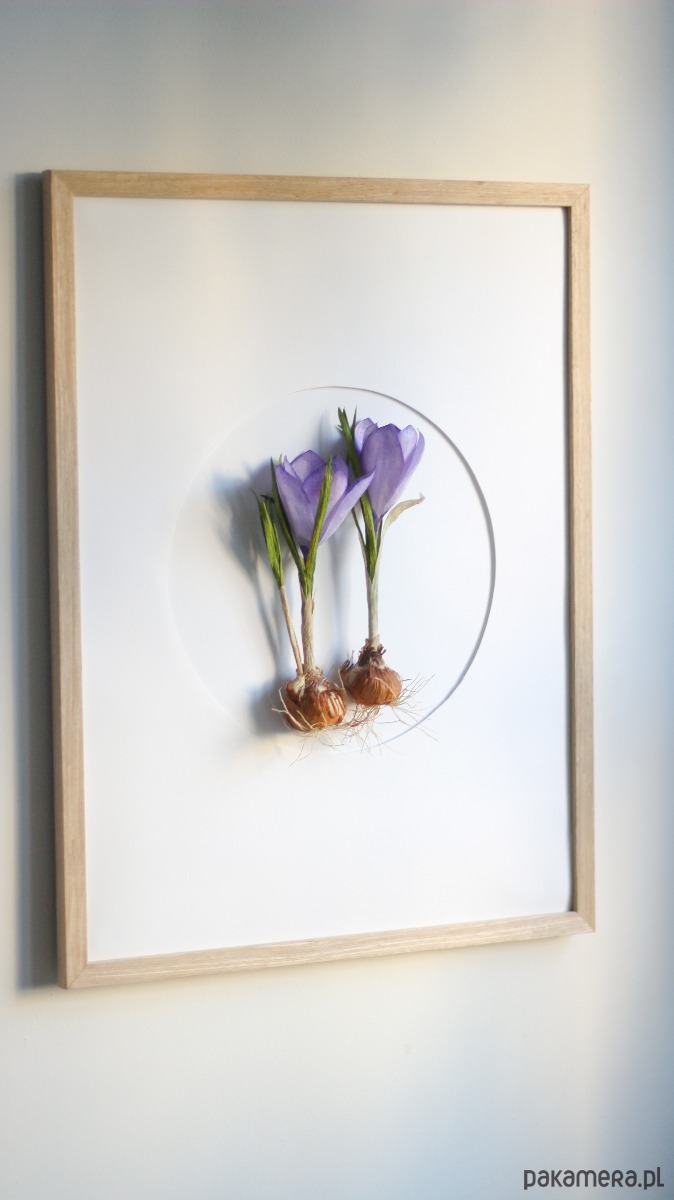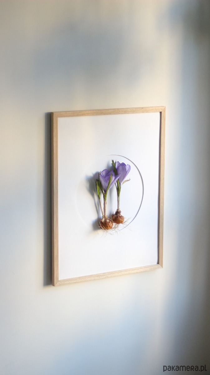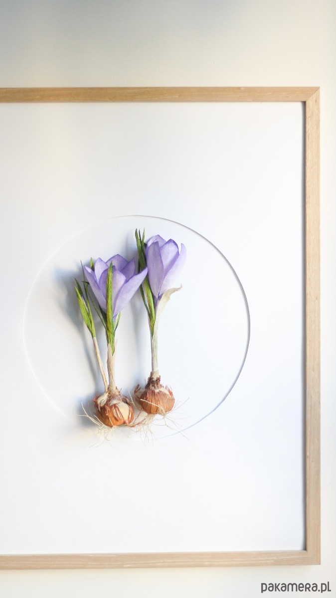 Dwa krokusy umieszczone w ramie, odstają od tła tworzą trójwymiarową kompozycję.