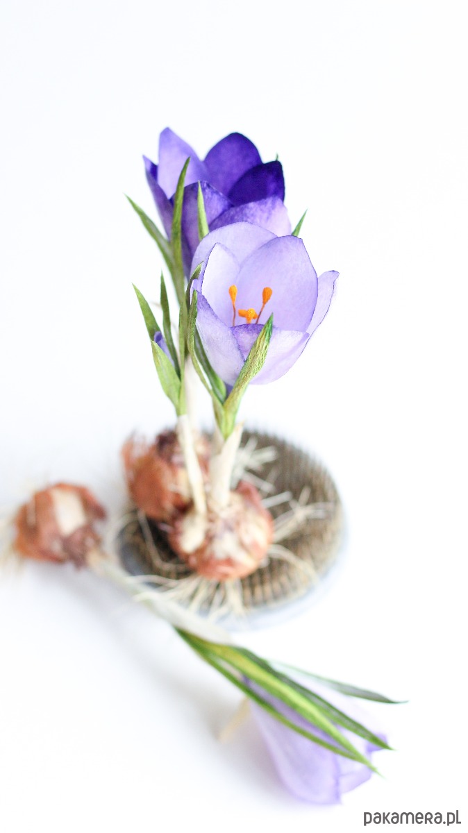 Krokusy przygotowane zostały ręcznie od podstaw z papieru i wysokiej jakości włoskiej krepiny. Każdy z płatków wycinany jest osobno, formowany ręcznie i malowany.