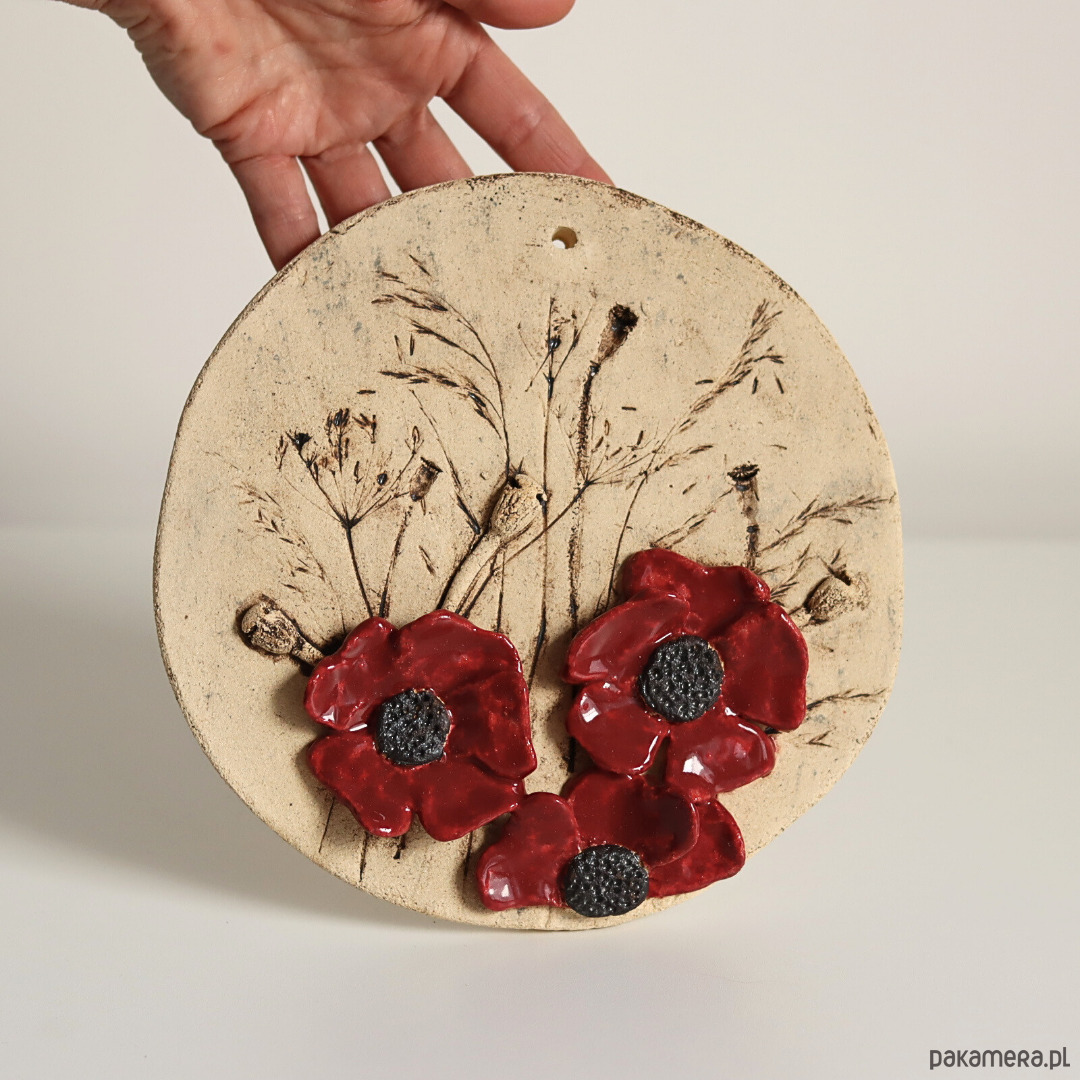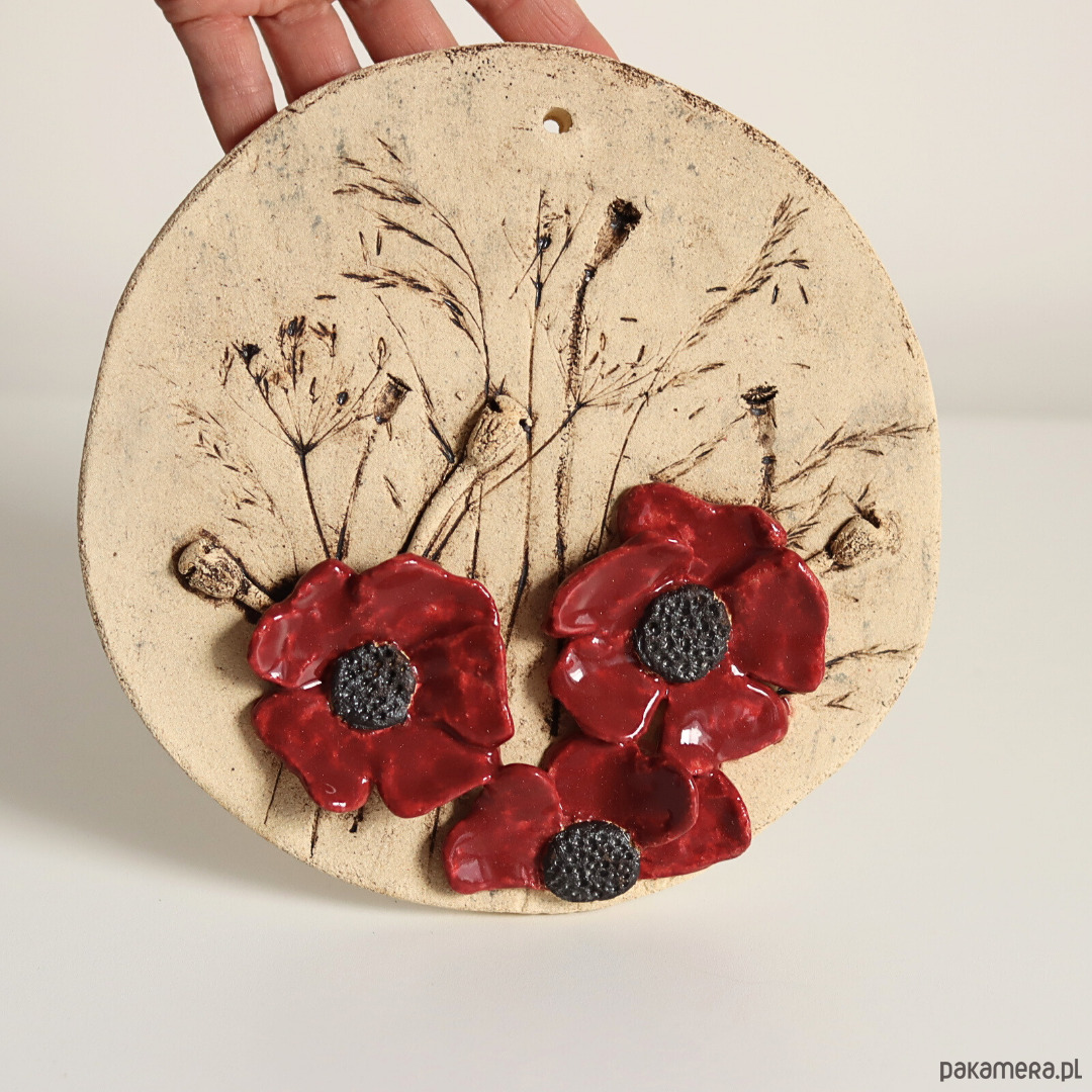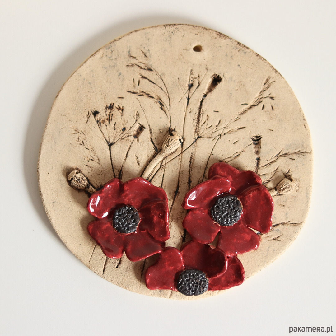 Dekoracja na ścianę, ręcznie wykonany okrągły obrazek ceramiczny 3d. Kafelek wykonany z masy szamotowej, wzór odbity z naturalnych roślin, trawy przetarte brązowym szkliwem, kwiaty w kolorze ciemnej czerwieni. Środki kwiatów czarne, satynowe.