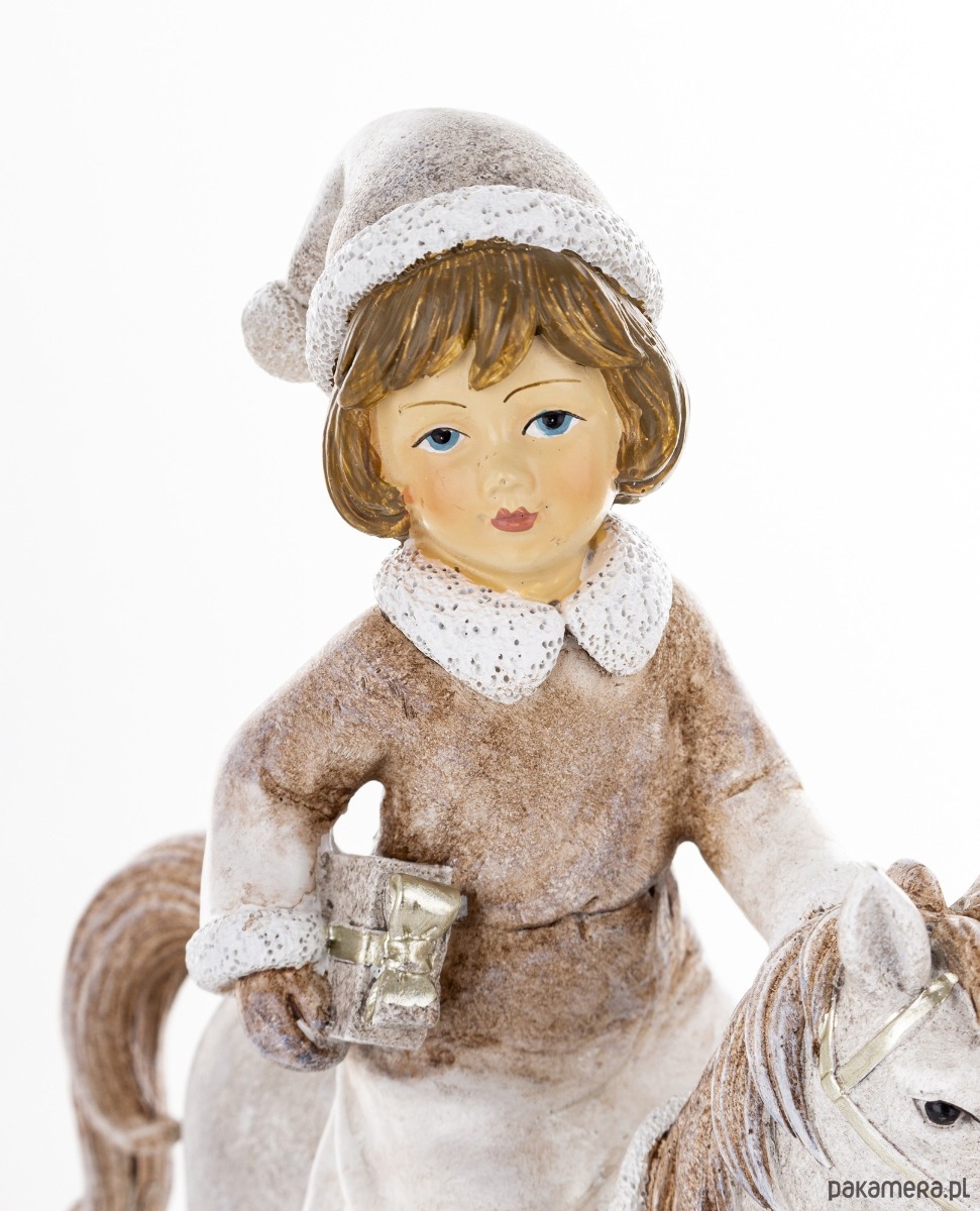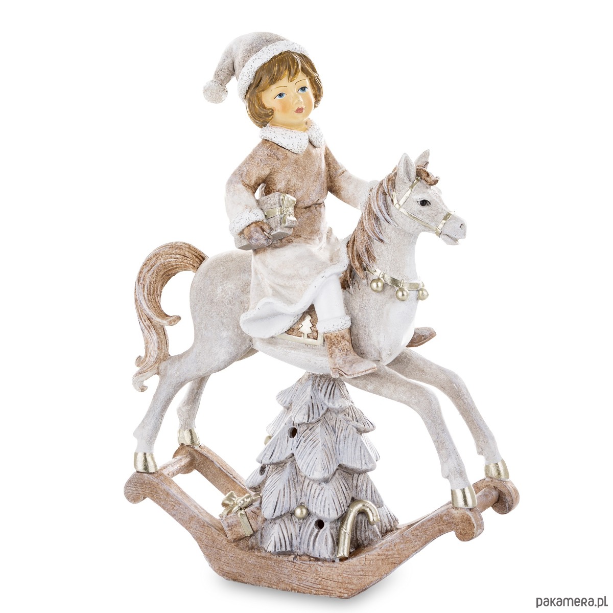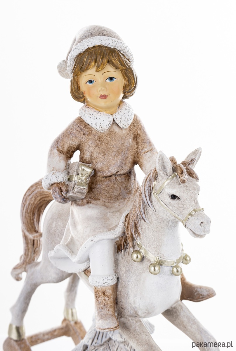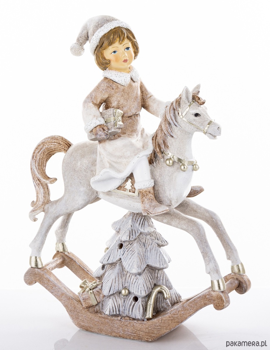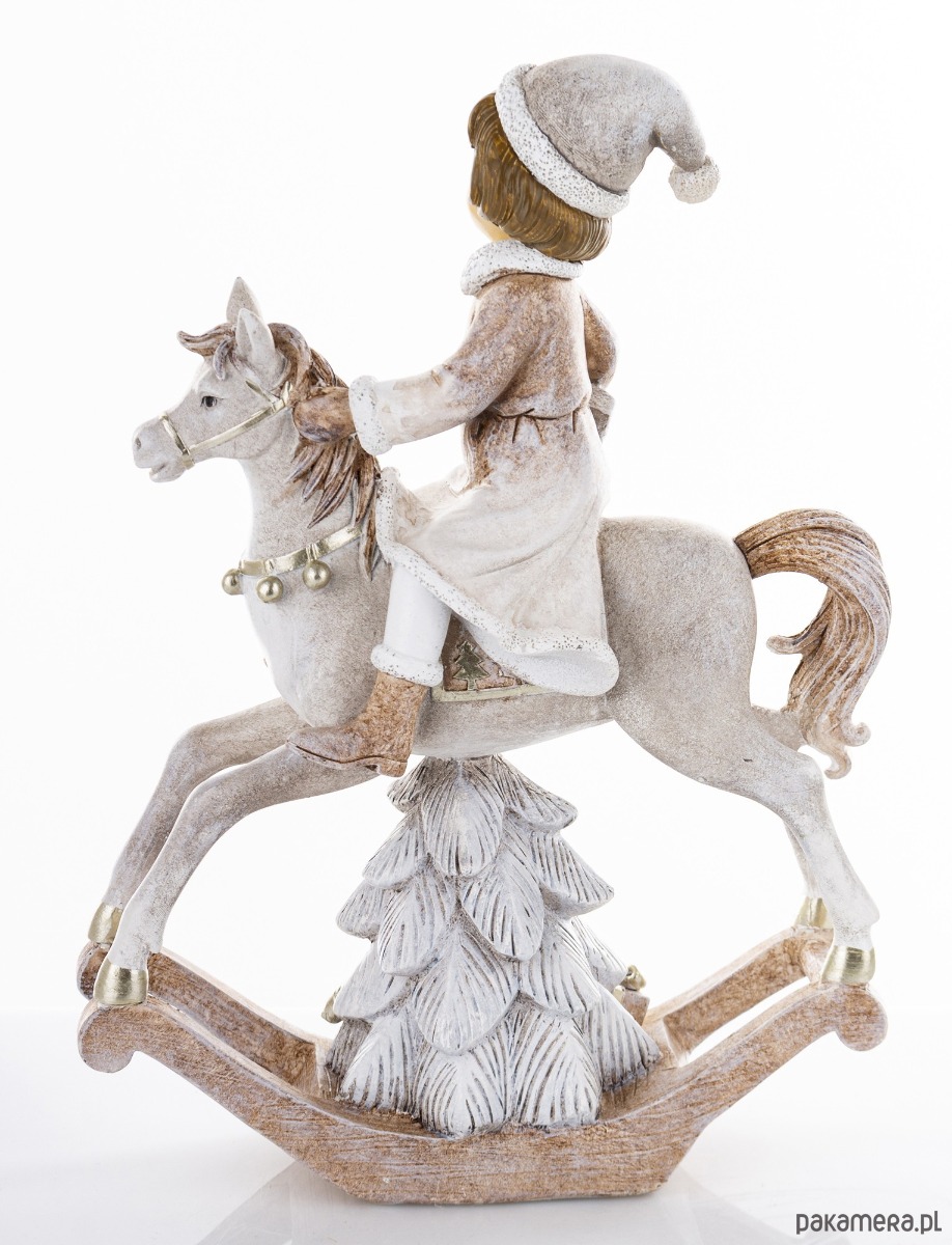 Efektowna figurka konia na biegunach i dziewczynki na nim siedzącej. Dekoracja wykonana z tworzywa sztucznego. Dziecko ubrane jest w ciepłą odzież w jasnych kolorach. Pod brzuchem konia umieszczona jest choinka i prezenty.