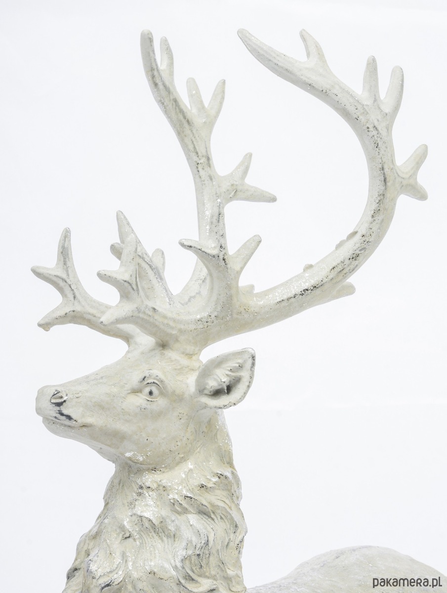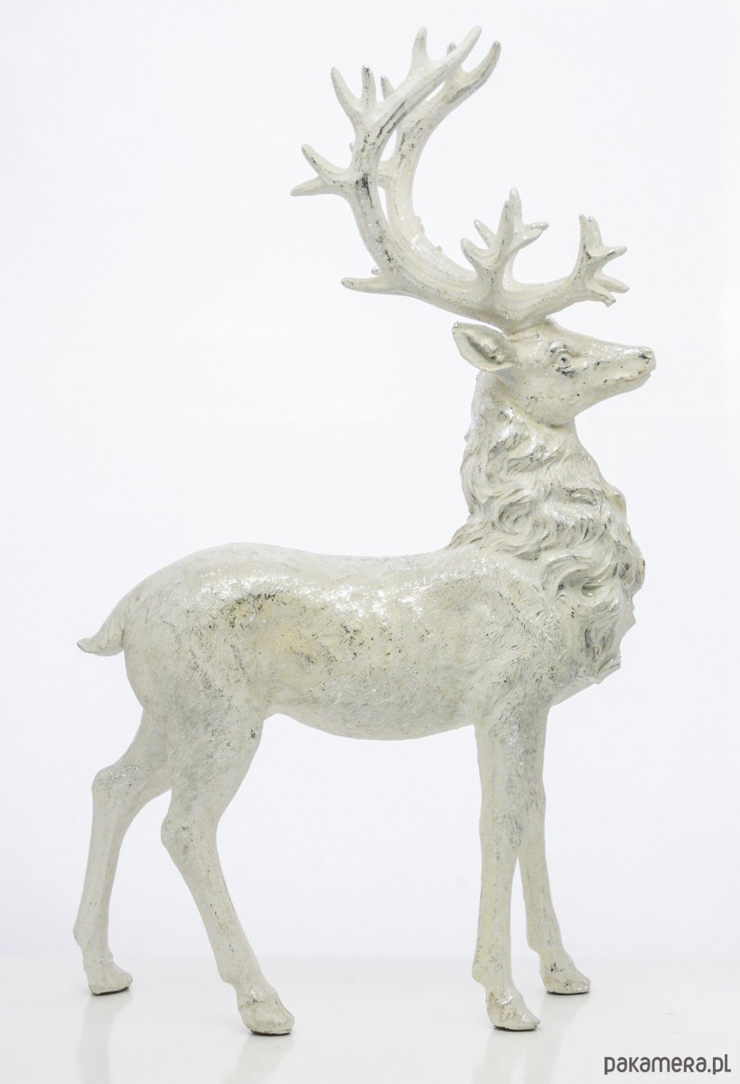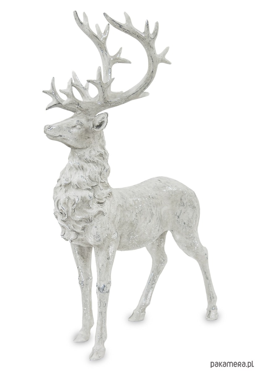 Piękna świąteczna dekoracja w postaci jelenia z wysokim srebrnym porożem. Wykonany z białego tworzywa sztucznego.