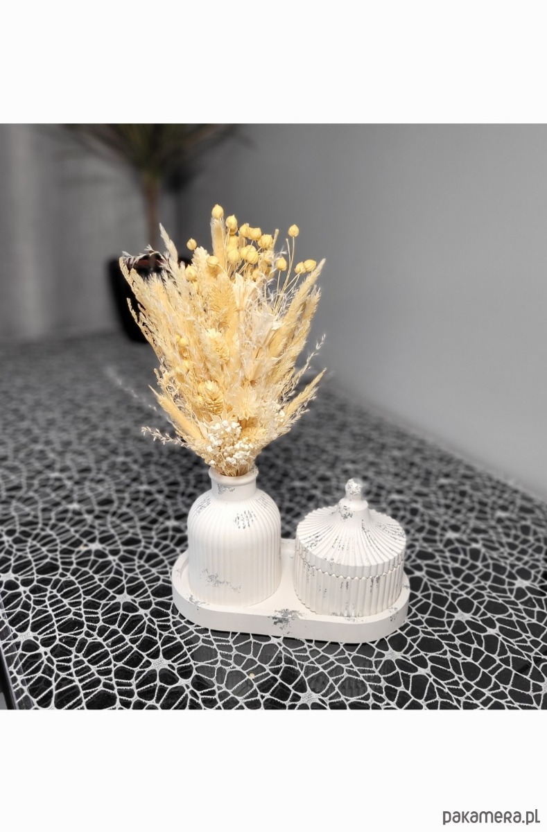Oryginalny wazon z gipsu z eleganckimi suszonymi kwiatami, które dodadzą przytulności Twojemu wnętrzu.
