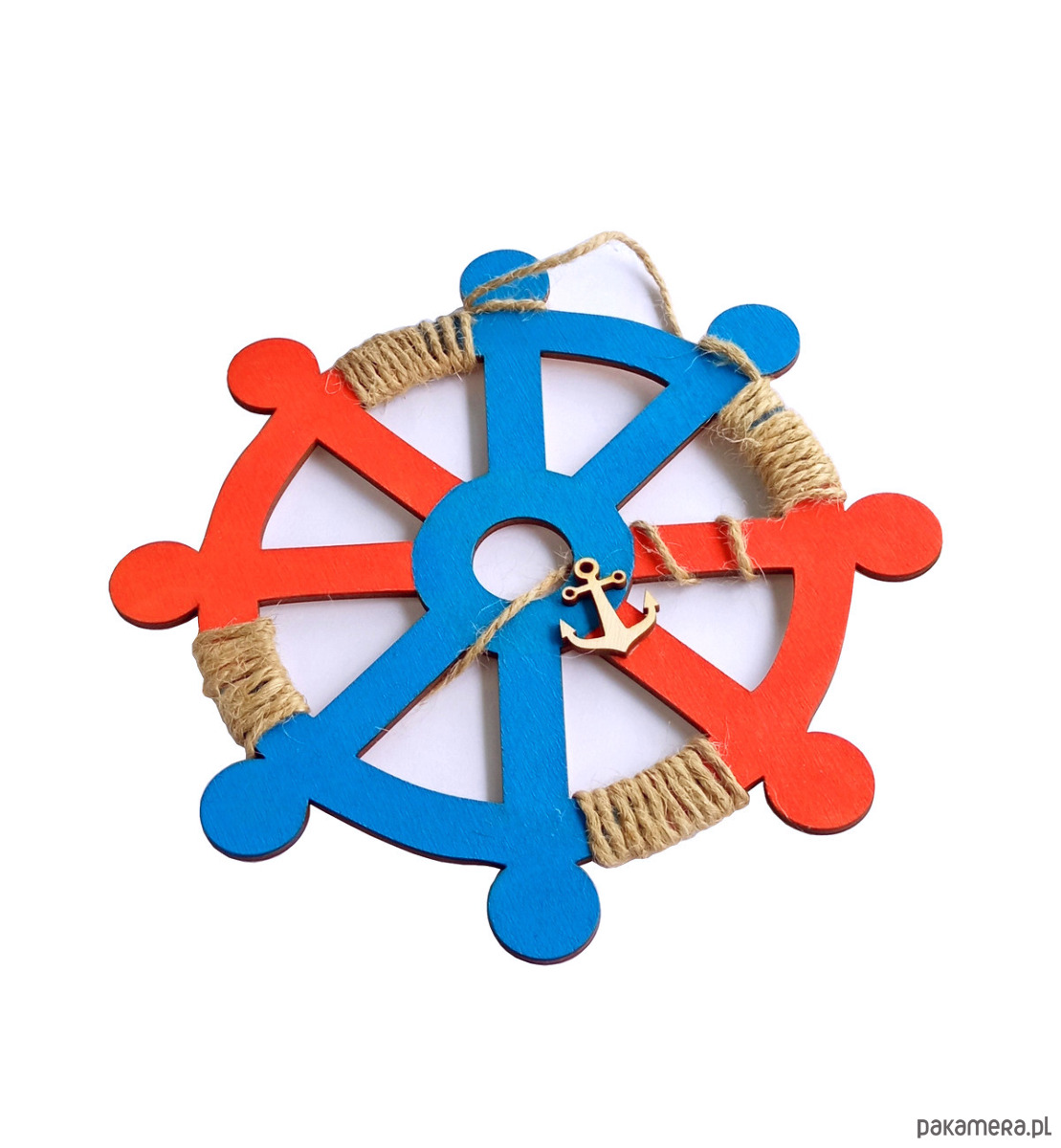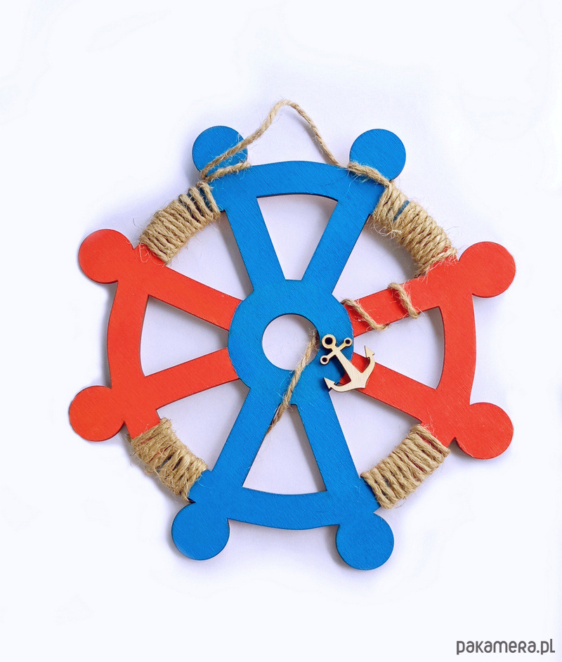 Koło wykonane ze sklejki, malowane farbami akrylowymi, zdobione sznurkiem.