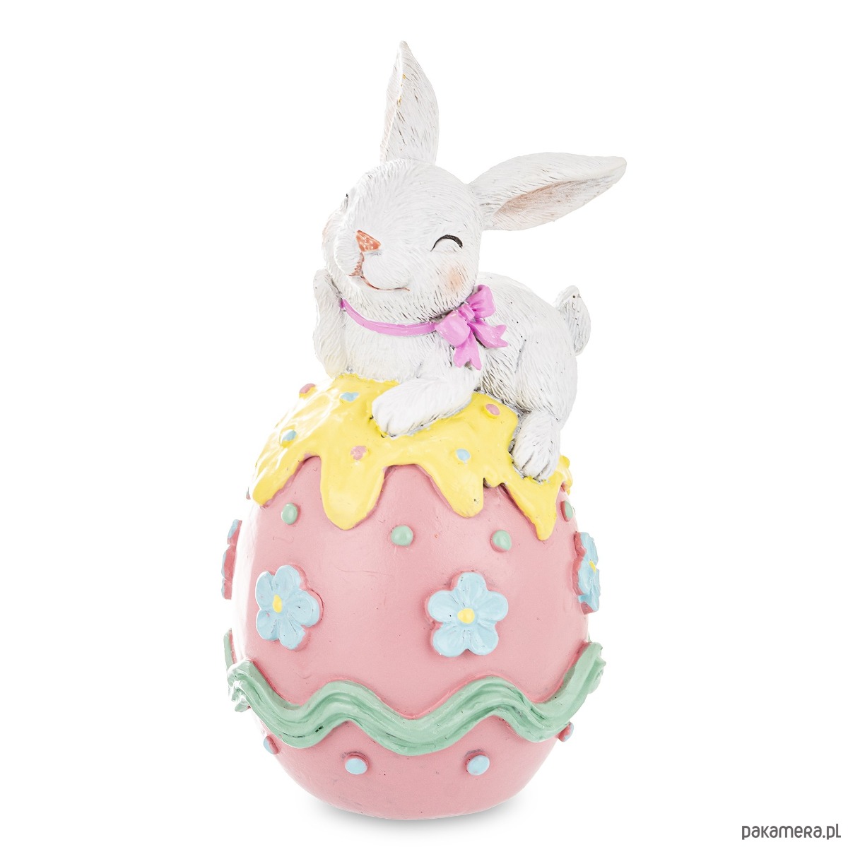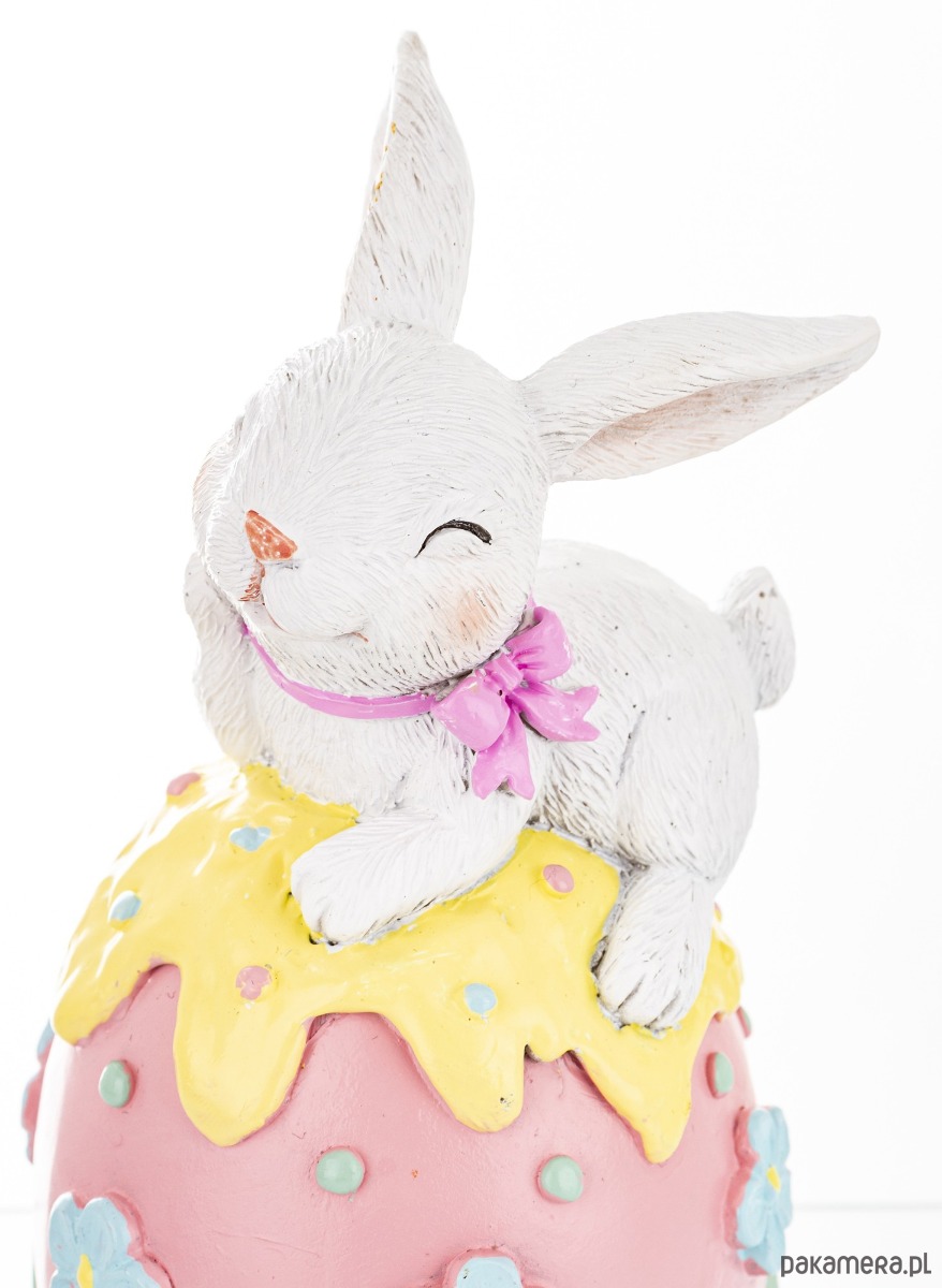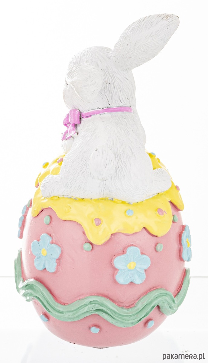 Urocza figurka wykonana z tworzywa sztucznego. Biała króliczka przytulona do kolorowej, różowej pisanki. Całość dekoracji utrzymana w pastelowych kolorach i będzie wesołym urozmaiceniem świątecznego wnętrza.