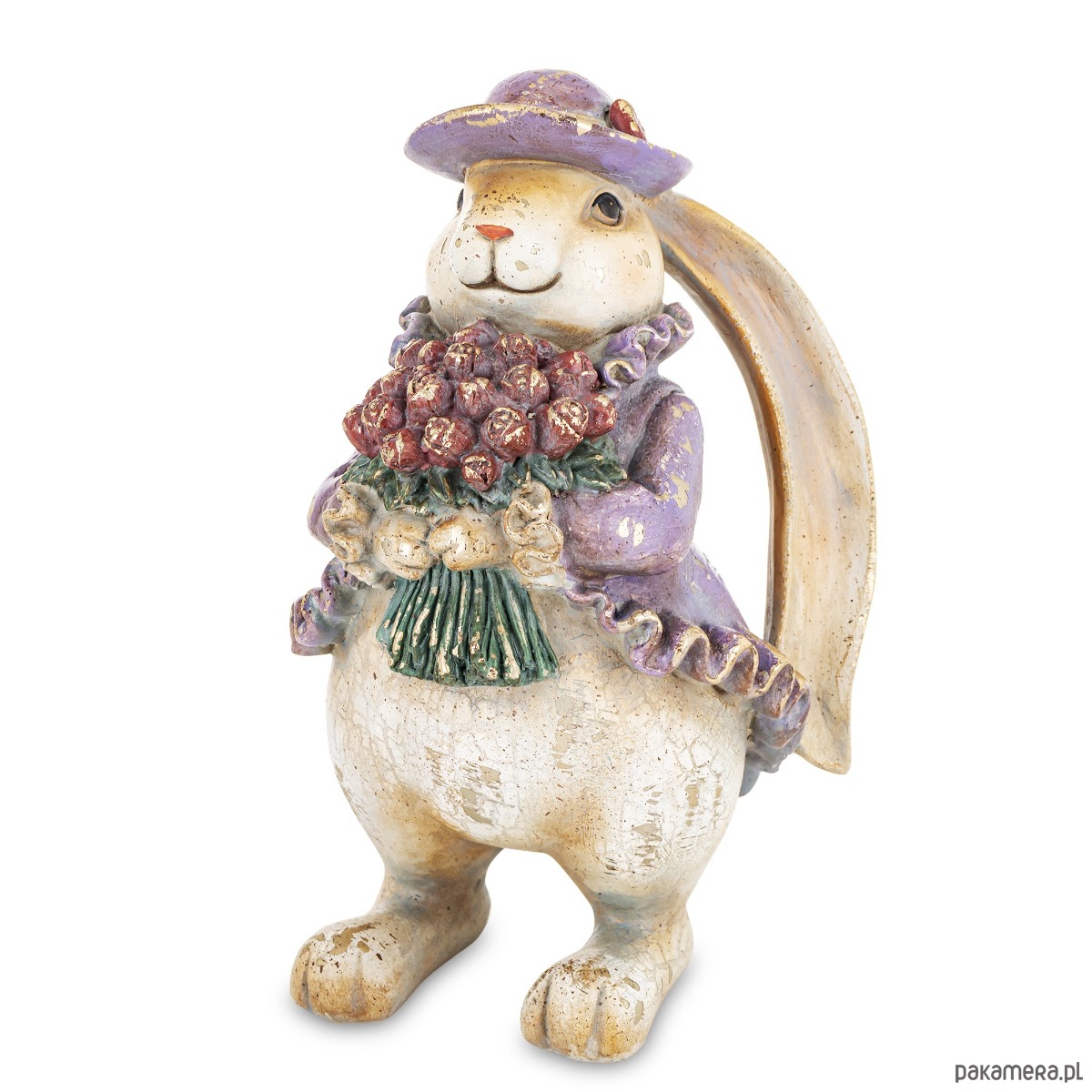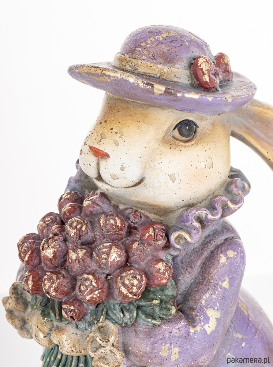 Urocza figurka wykonana z kolorowego tworzywa sztucznego, celowo postarzana. Przedstawia króliczkę o bardzo długich uszach, w niebieskim żakiecie i kapelusiku. W łapkach trzyma duży bukiet kwiatów. Figurka jest wszechstronna i można ją łatwo dopasować do różnych przestrzeni.