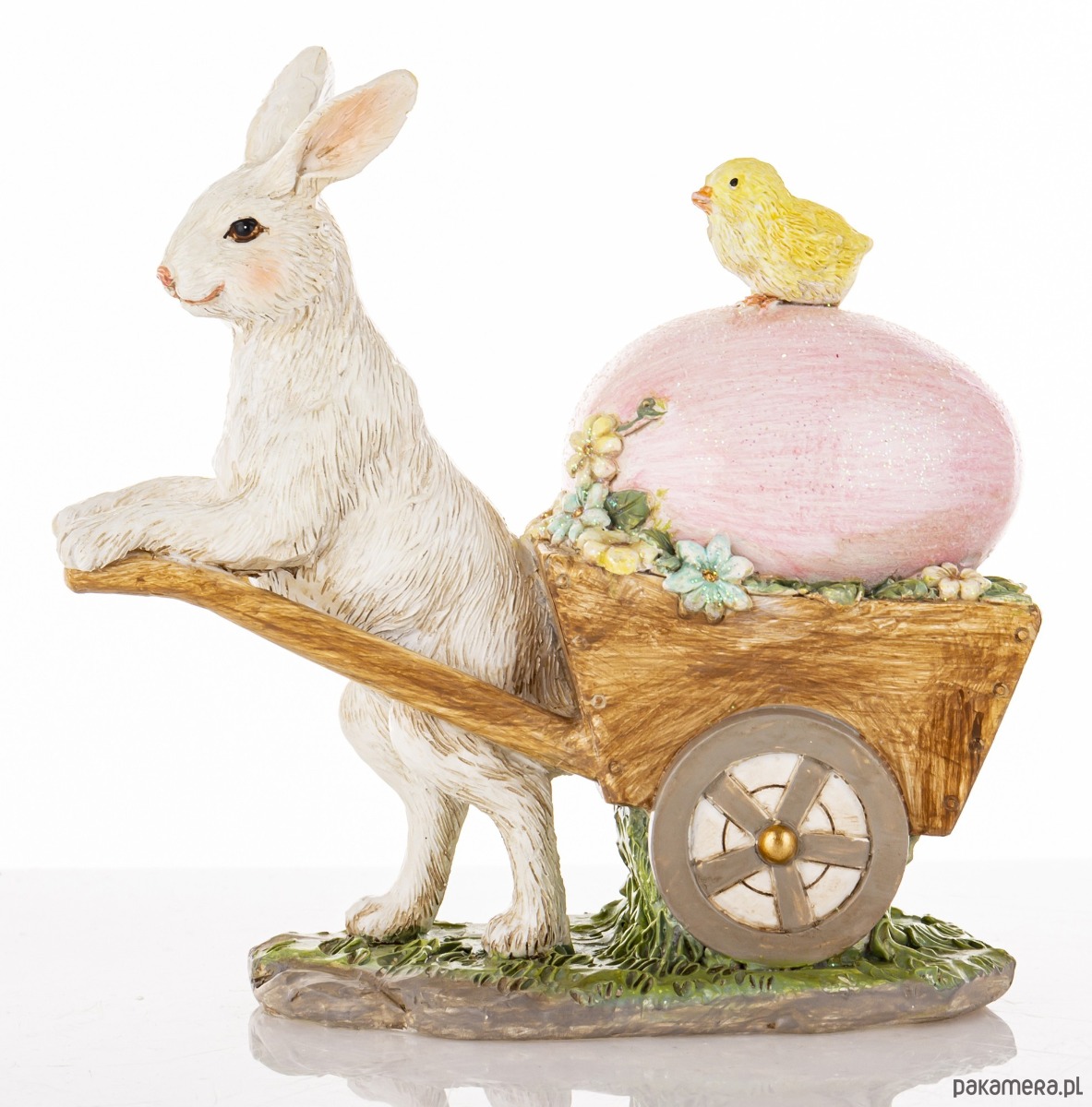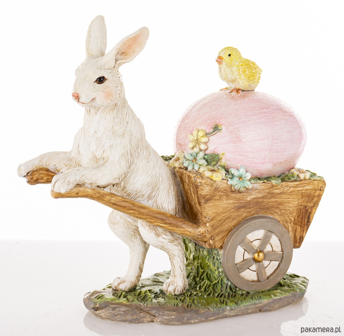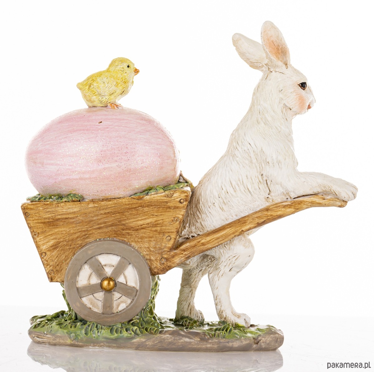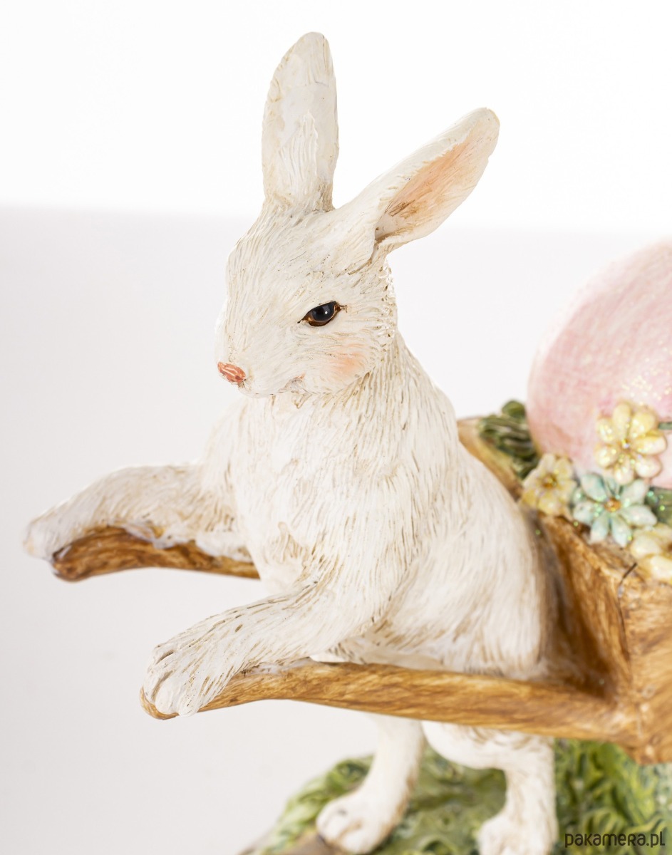 Figurka wykonana z kolorowego tworzywa sztucznego. Biały królik ciągnie brązową taczkę z dużym różowym jajkiem, na którym siedzi żółty kurczaczek. Całość dekoracji będzie wesołym urozmaiceniem świątecznego wnętrza.