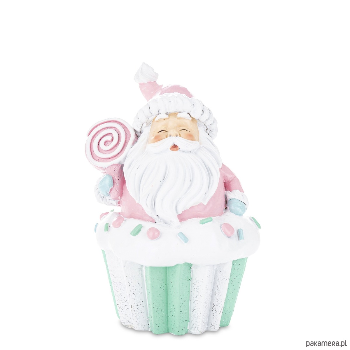 Figurka dekoracyjna w postaci świętego Mikołaja, który siedzi na muffince. Wykonana została z tworzywa sztucznego. Postać ma na sobie różowe ubranie i czapkę, a muffinka jest zielono-biała. Biała obfita broda jest na pierwszym planie.