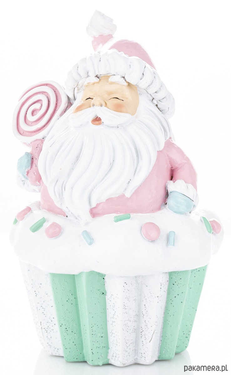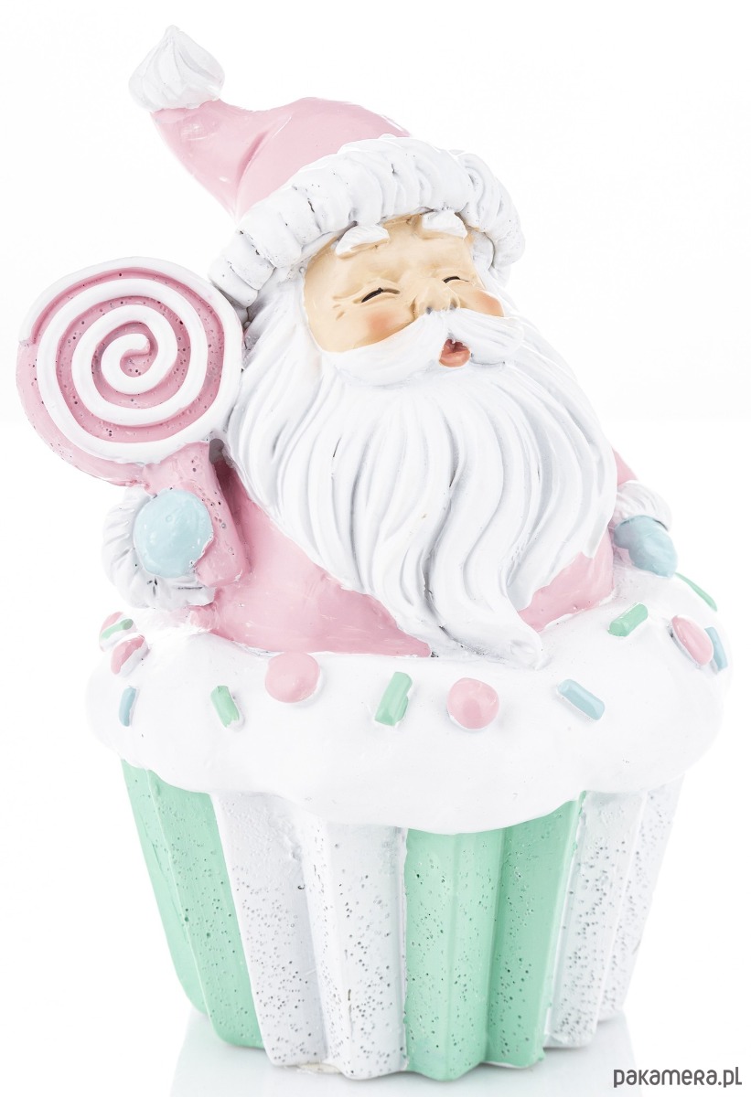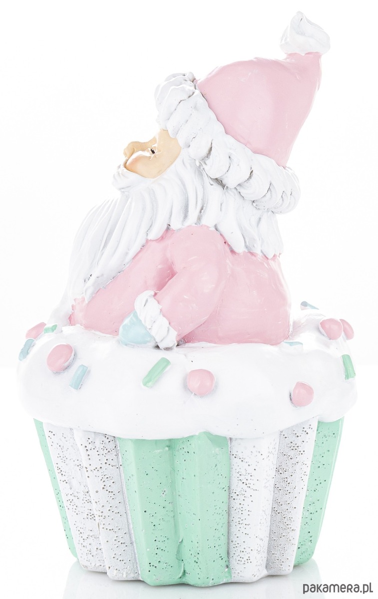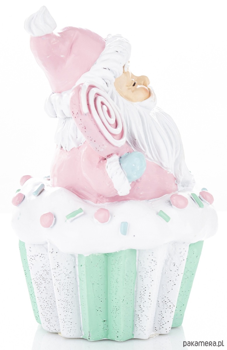 Figurka dekoracyjna w postaci świętego Mikołaja, który siedzi na muffince. Wykonana została z tworzywa sztucznego. Postać ma na sobie różowe ubranie i czapkę, a muffinka jest zielono-biała. Biała obfita broda jest na pierwszym planie.