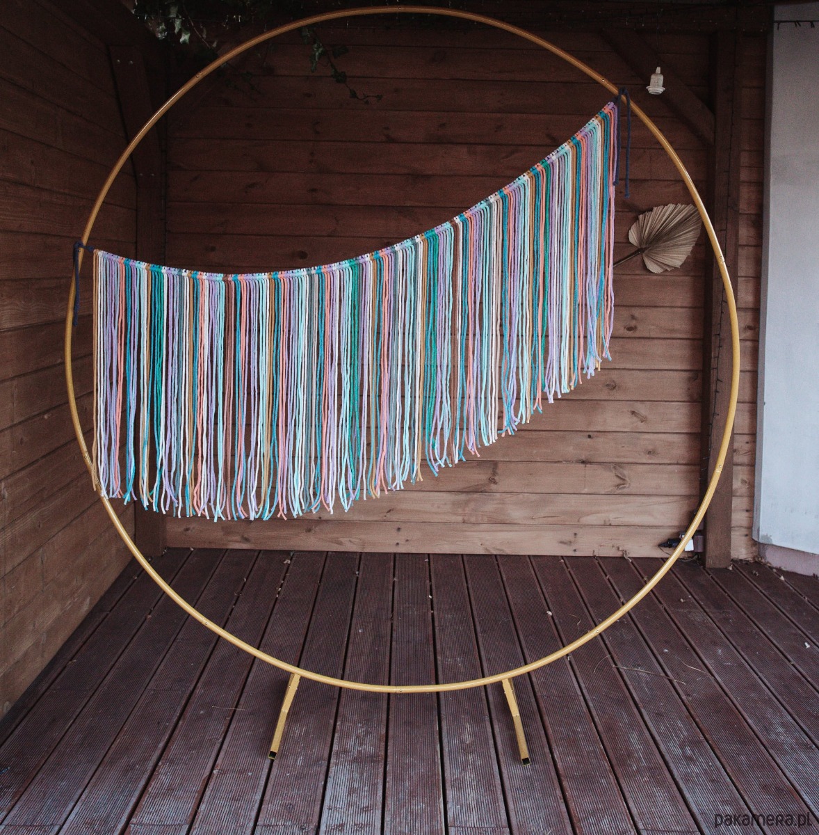 Kolorowa dekoracja wykonana ze sznurków.. Nadają się na obręcz (na zdjęciu obręcz 2 m) szerokosc około 160cm.. Długość 70cm.. Cena dotyczy frędzli bez obreczy.. Super na ślub.. Przyjęcie jako ścianka do zdjęć.. Można dodac kwiaty do dekoracji.. Dostępne od ręki!