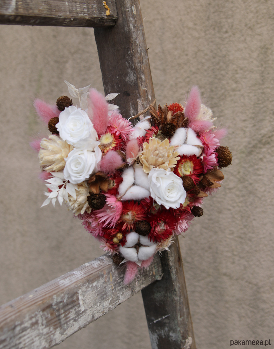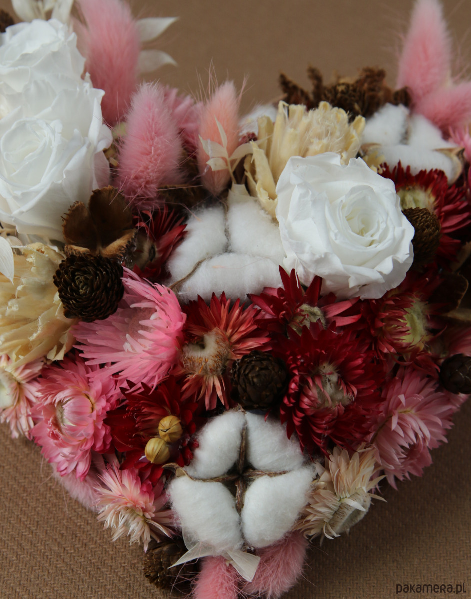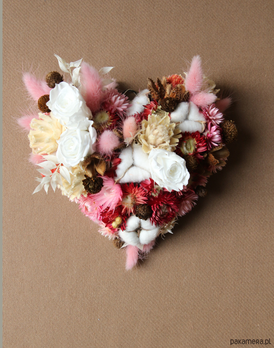 Dekoracja ścienna w kształcie serca ze stabilizowanymi białymi różami, bawełną i suszonymi kwiatami- idealna na Walentynki.