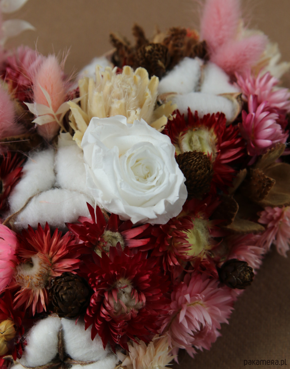 Wyjątkowa dekoracja z wiecznymi różami. Biało kremowo czerwona. Romantyczna, delikatna i naturalna- wprowadza ciepły klimat do każdego wnętrza.