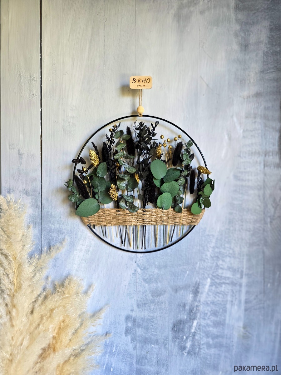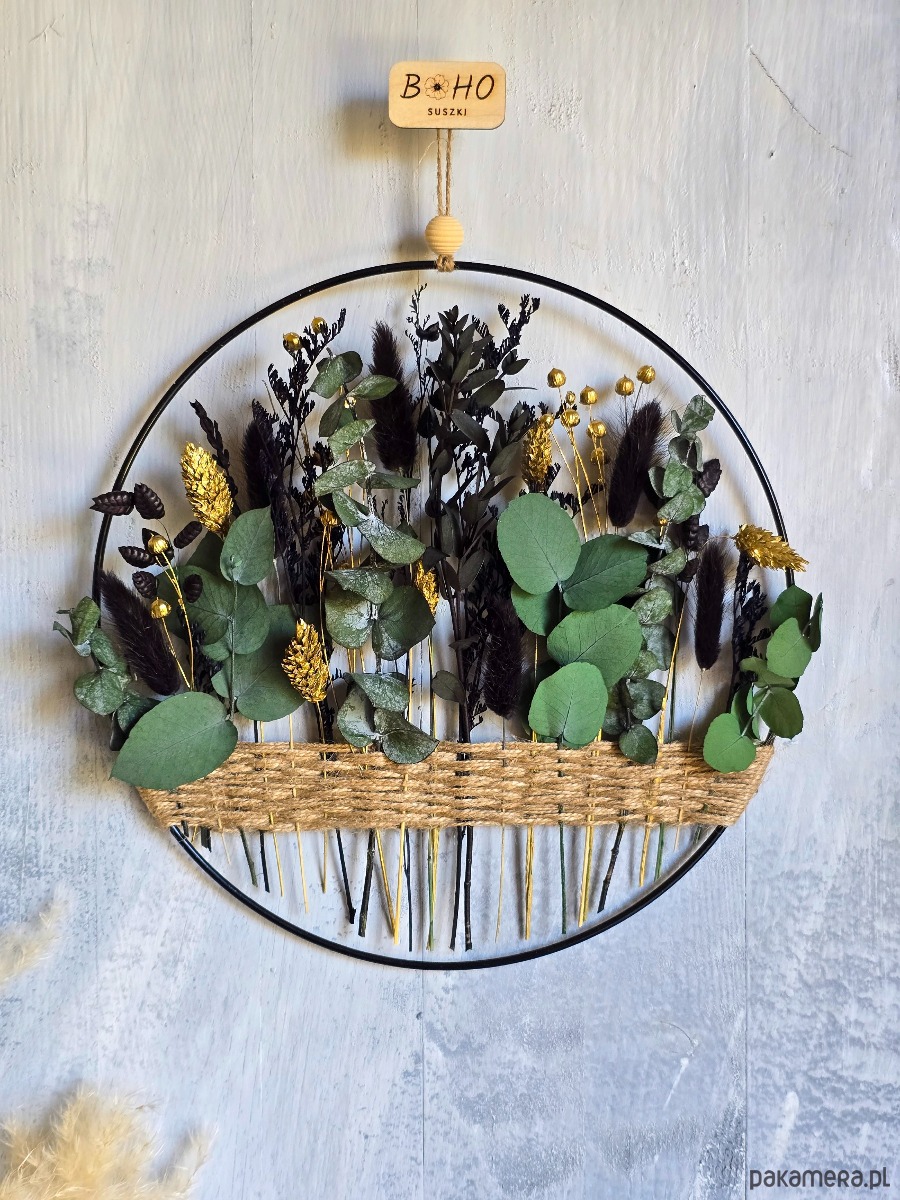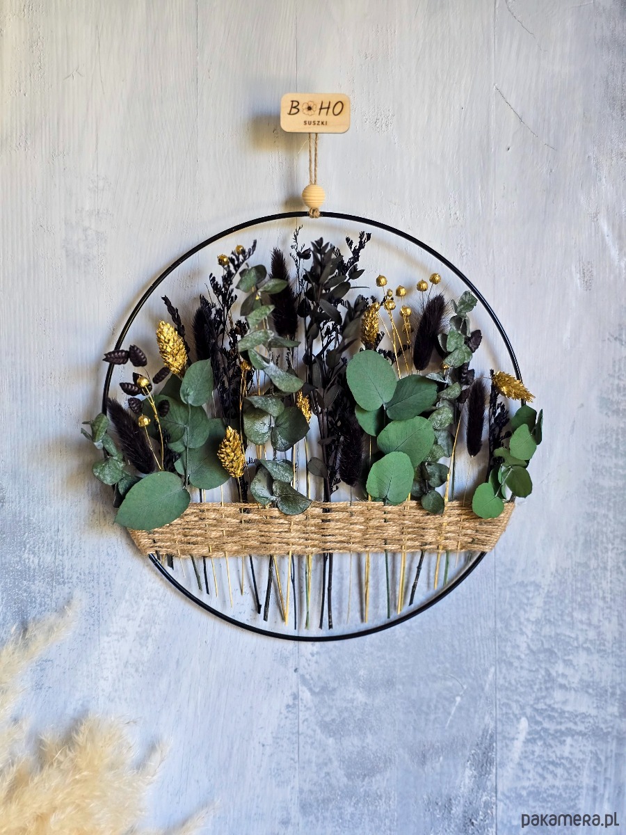 🖤 Elegancka i nowoczesna dekoracja - metalowa obręcz ozdobiona sznurkiem jutowym, stabilizowanym zielonym eukaliptusem oraz suszonymi kwiatami w kolorze czarnym i złotym.
