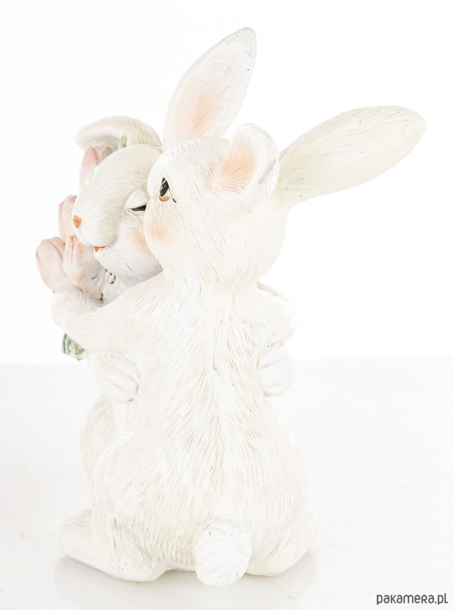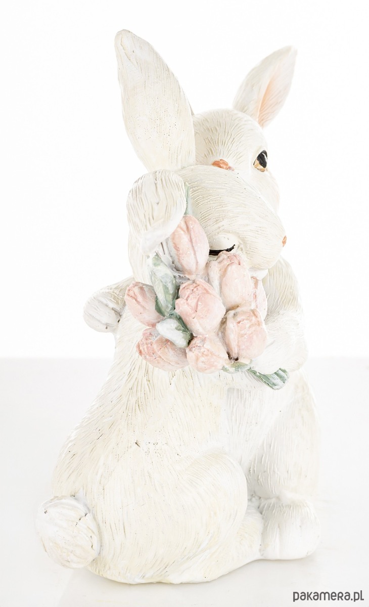 Dwa białe króliczki przytulone do siebie zostały wykonane z wysokiej jakości tworzywa sztucznego. Jeden z nich trzyma bukiet różowych tulipanów. Urocza dekoracja na Wielkanoc.