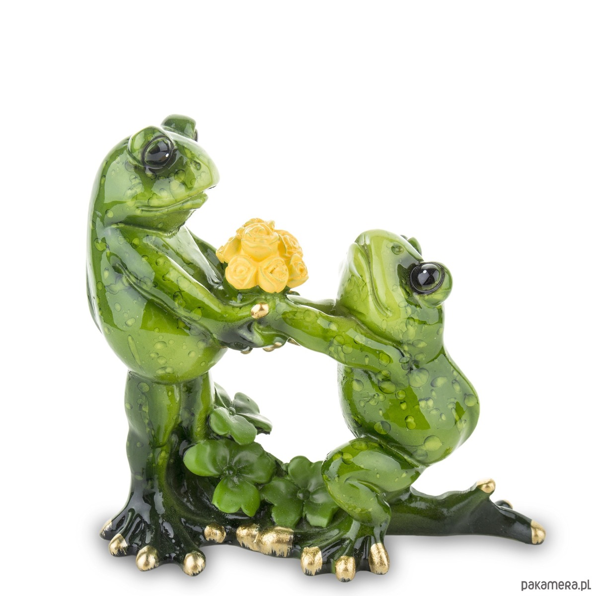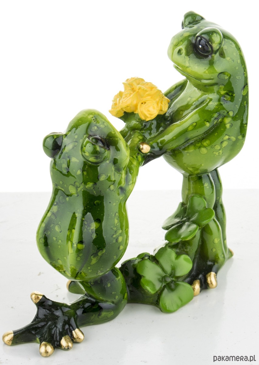 Komplet 2 figurek przedstawiających zielone żabki - pan i pani. Wykonane z tworzywa sztucznego w kolorze zielonym. Scenka przedstawia oświadczyny - pan żaba klęczy i wręcza bukiet żółtych kwiatów swojej wybrance. Komplet doskonale sprawdzi się jako element dekoracyjny w salonie na parapecie, czy stole lub jako prezent. Jego przyjazny charakter doda uroku każdemu miejscu, w którym się znajdzie.