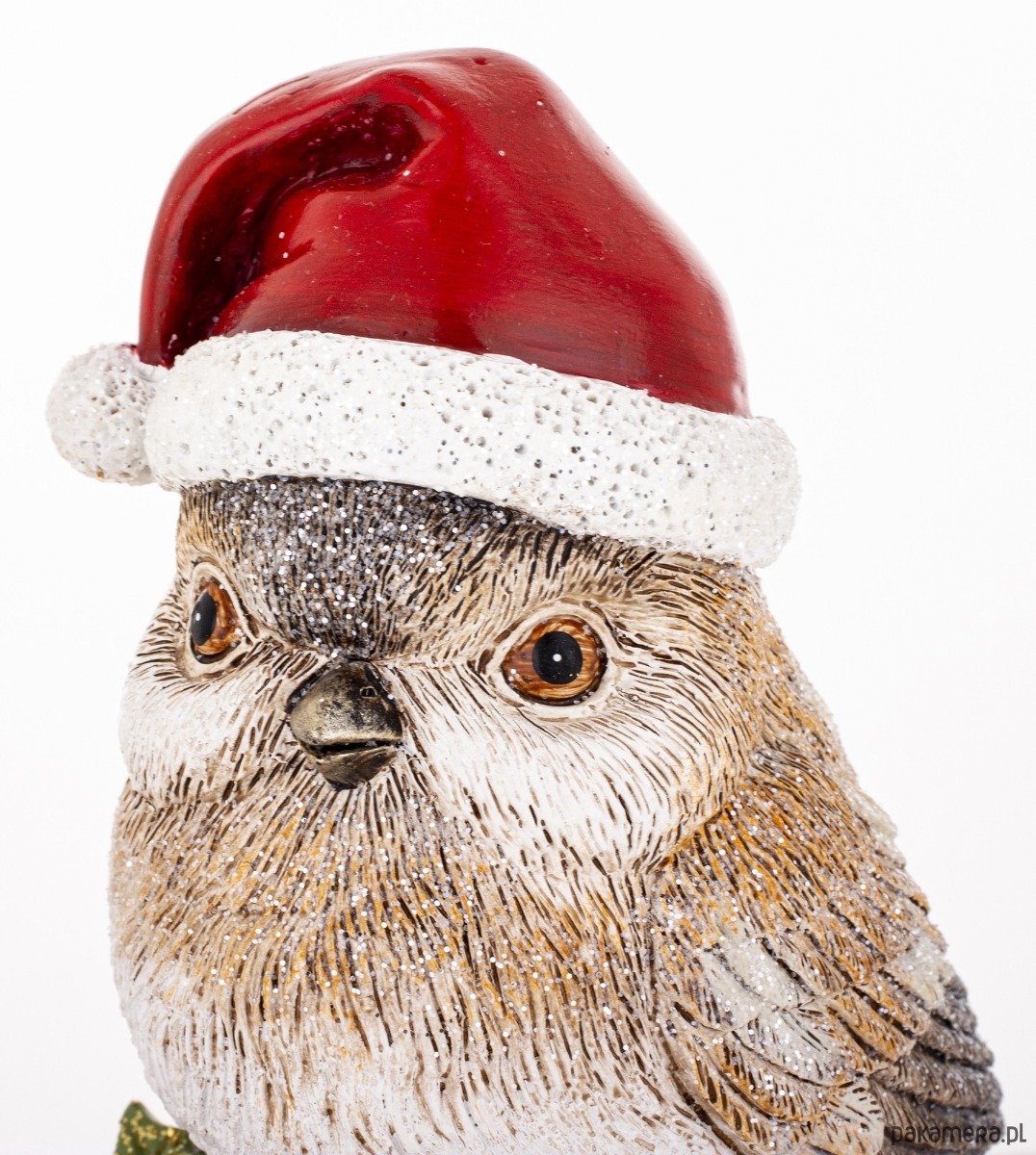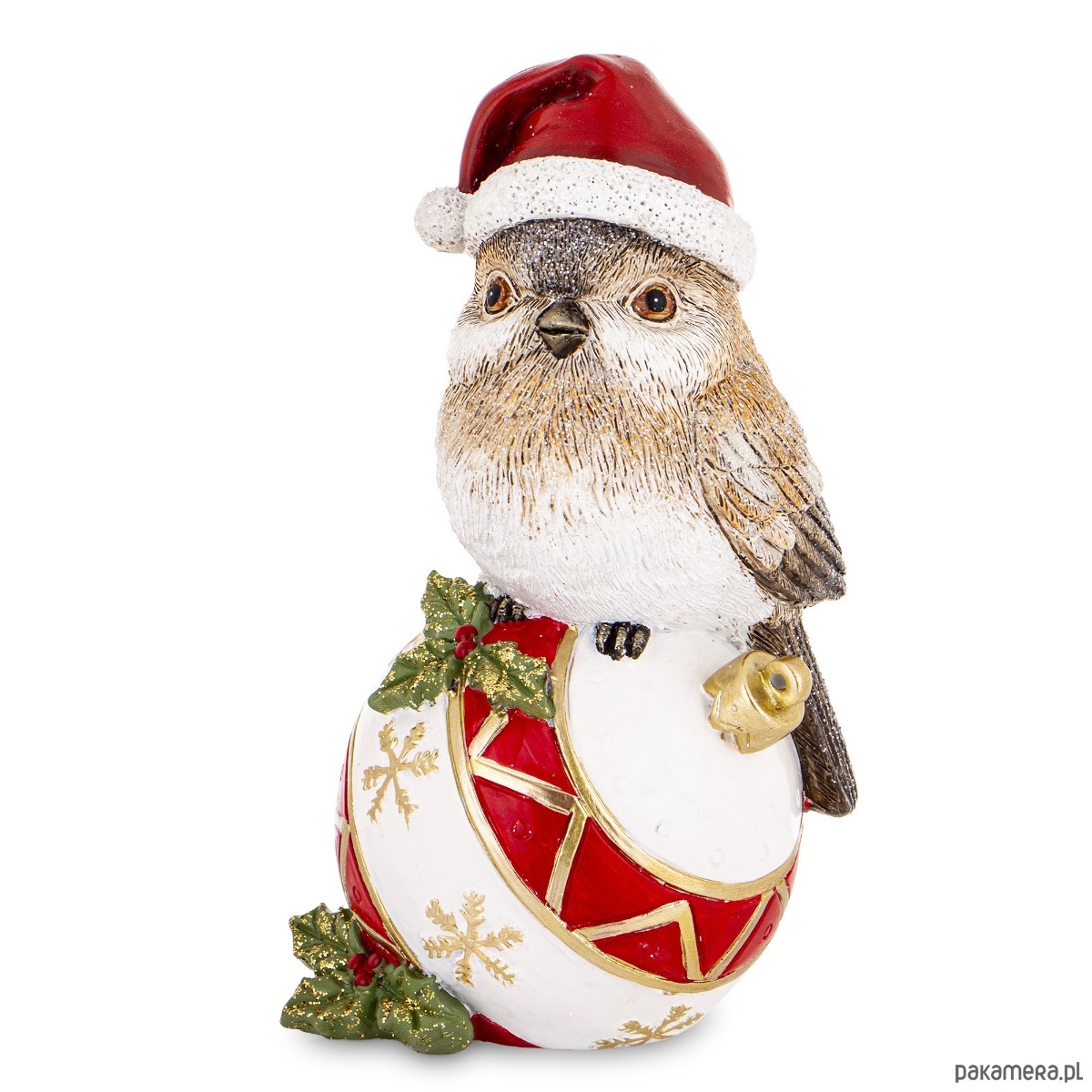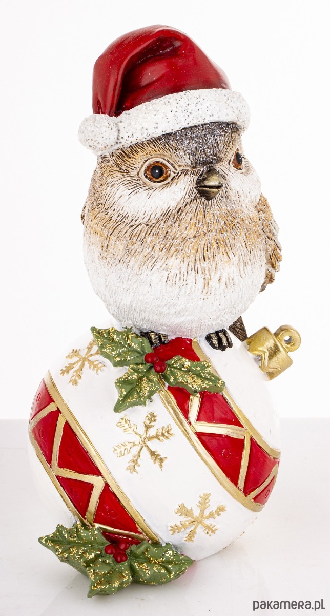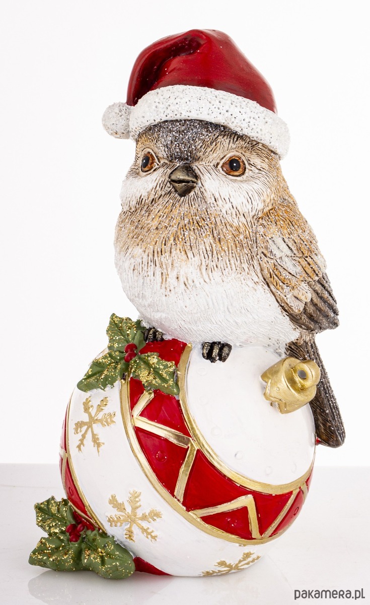 Wykonana z tworzywa sztucznego dekoracja świąteczna. Piękna bombka, a na niej siedzi ptaszek w zimowej czapeczce. Będzie niezwykłą ozdobą choinki.